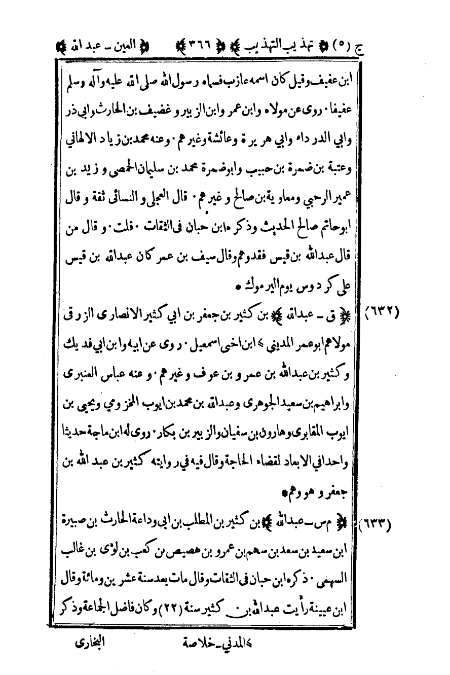632 - "ق - عبد الله" بن كثير بن جعفر بن أبي كثير الأنصاري الزرقي مولاهم أبو عمر المديني1 بن أخي إسماعيل روى عن أبيه وابن أبي فديك وكثير بن عبد الله بن عمرو بن عوف وغيرهم وعنه عباس العنبري وإبراهيم بن سعيد الجوهري وعبد الله بن محمد بن أيوب المخزومي ويحيى بن أيوب المقابري وهارون بني سفيان والزبير بن بكار روى له بن ماجة حديثا واحدا في الأبعاد لقضاء الحاجة وقال فيه في روايته كثير بن عبد الله بن جعفر وهو وهم.