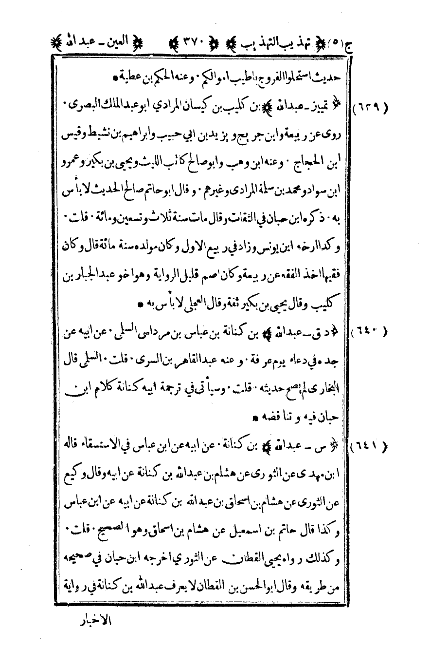 640 - "د ق - عبد الله" بن كنانة بن عباس بن مرداس السلمي عن أبيه عن جده في دعاء يوم عرفة وعنه عبد القاهر بن السري قلت السلمي قال البخاري لم يصح حديثه قلت وسيأتي في ترجمة أبيه كنانة كلام بن حبان فيه وتناقضه.