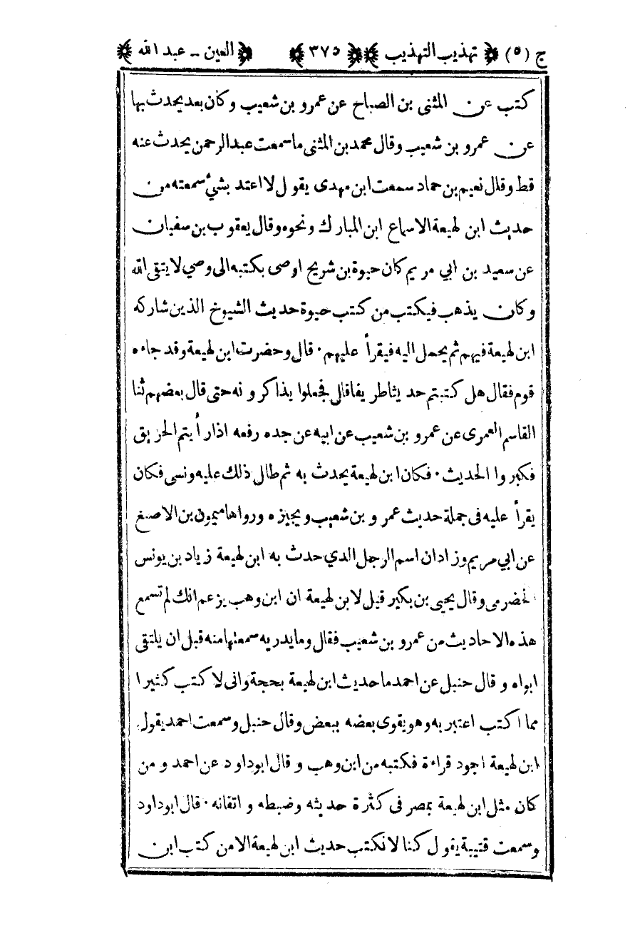 كتب عن المثنى بن الصباح عن عمرو بن شعيب وكان بعد يحدث بها عن عمرو بن شعيب وقال محمد بن المثنى ما سمعت عبد الرحمن يحدث عنه قط وقال نعيم بن حماد سمعت بن مهدي يقول لا أعتد بشيء سمعته من حديث بن لهيعة إلا سماع بن المبارك ونحوه وقال يعقوب بن سفيان عن سعيد بن أبي مريم كان حيوة بن شريح أوصى بكتبه إلى وصي لا يتقي الله وكان يذهب فيكتب من كتب حيوة حديث الشيوخ الذين شاركه بن لهيعة فيهم ثم يحمل إليه فيقرأ عليهم قال وحضرت بن لهيعة وقد جاءه قوم فقال هل كتبتم حديثا طريفا قال فجعلوا يذاكرونه حتى قال بعضهم ثنا القاسم العمري عن عمرو بن شعيب عن أبيه عن جده رفعه إذا رأيتم الحريق فكبروا الحديث فكان ابن لهيعة يحدث به ثم طال ذلك عليه ونسي فكان يقرأ عليه في جملة حديث عمرو بن شعيب ويجيزه ورواها ميمون بن الأصبغ عن أبي مريم وزاد أن اسم الرجل الذي حدث بن لهيعة زياد بن يونس الحضرمي وقال يحيى بن بكير قيل لابن لهيعة أن بن وهب يزعم إنك لم تسمع هذه الأحاديث من عمرو بن شعيب فقال وما يدريه سمعتها منه قبل أن يلتقي أبواه وقال حنبل عن أحمد ما حديث بن لهيعة بحجة وإني لأكتب كثيرا مما أكتب أعتبر به وهو يقوي بعضه ببعض وقال حنبل وسمعت أحمد يقول بن لهيعة أجود قراءة فكتبه من بن وهب وقال أبو داود عن أحمد ومن كان مثل بن لهيعة بمصر في كثير حديثه وضبطه وإتقانه قال أبو داود وسمعت قتيبة يقول كنا لا نكتب حديث بن لهيعة إلا من كتب بن