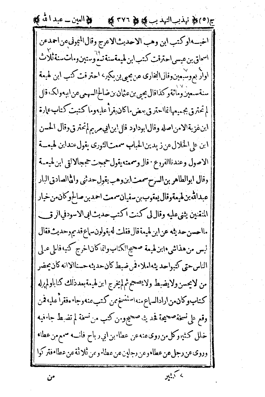 أخيه أو كتب بن وهب إلا حديث الأعرج وقال الميموني عن أحمد عن إسحاق بن عيسى احترقت كتب بن لهيعة سنة تسع وستين ومات سنة ثلاث أو أربع وسبعين وقال البخاري عن يحيى بن بكير1 احترقت كتب بن لهيعة سنة سبعين ومائة وكذا قال يحيى بن عثمان بن صالح السهمي عن أبيه ولكنه قال لم تحترق بجميعها إنما احترق بعض ما كان يقرأ عليه وما كتبت كتاب عمارة بن غزية إلا من أصله وقال أبو داود قال ابن أبي مريم لم تحترق وقال الحسن بن علي الخلال عن زيد بن الحباب سمعت الثوري يقول عند بن لهيعة الأصول وعندنا الفروع قال وسمعته يقول حججت حججا لألقى بن لهيعة وقال أبو الطاهر بن السرح سمعت بن وهب يقول حدثني والله الصادق البار عبد الله بن لهيعة وقال يعقوب بن سفيان سمعت أحمد بن صالح وكان من خيار المتقنين يثني عليه وقال لي كنت أكتب حديث أبي الأسود في الرق ما أحسن حديثه عن ابن لهيعة قال فقلت له ويقولون سماع قديم وحديث فقال ليس من هذا شيء بن لهيعة صحيح الكتاب وإنما كان أخرج كتبه فأملى على الناس حتى كتبوا حديثه إملاء فمن ضبط كان حديثه حسنا إلا أنه كان يحضر من لا يحسن ولا يضبط ولا يصحح ثم لم يخرج بن لهيعة بعد ذلك كتابا ولم ير له كتاب وكان من أراد السماع منه استنسخ ممن كتب عنه وجاءه فقرأ عليه فمن وقع على نسخة صحيحة فحديثه صحيح ومن كتب من نسخة لم تضبط جاء فيه خلل كثير وكل من روى عنه عن عطاء بن أبي رباح فإنه سمع من عطاء وروى عن رجل عن عطاء وعن رجلين عن عطاء وعن ثلاثة عن عطاء فتركوا
