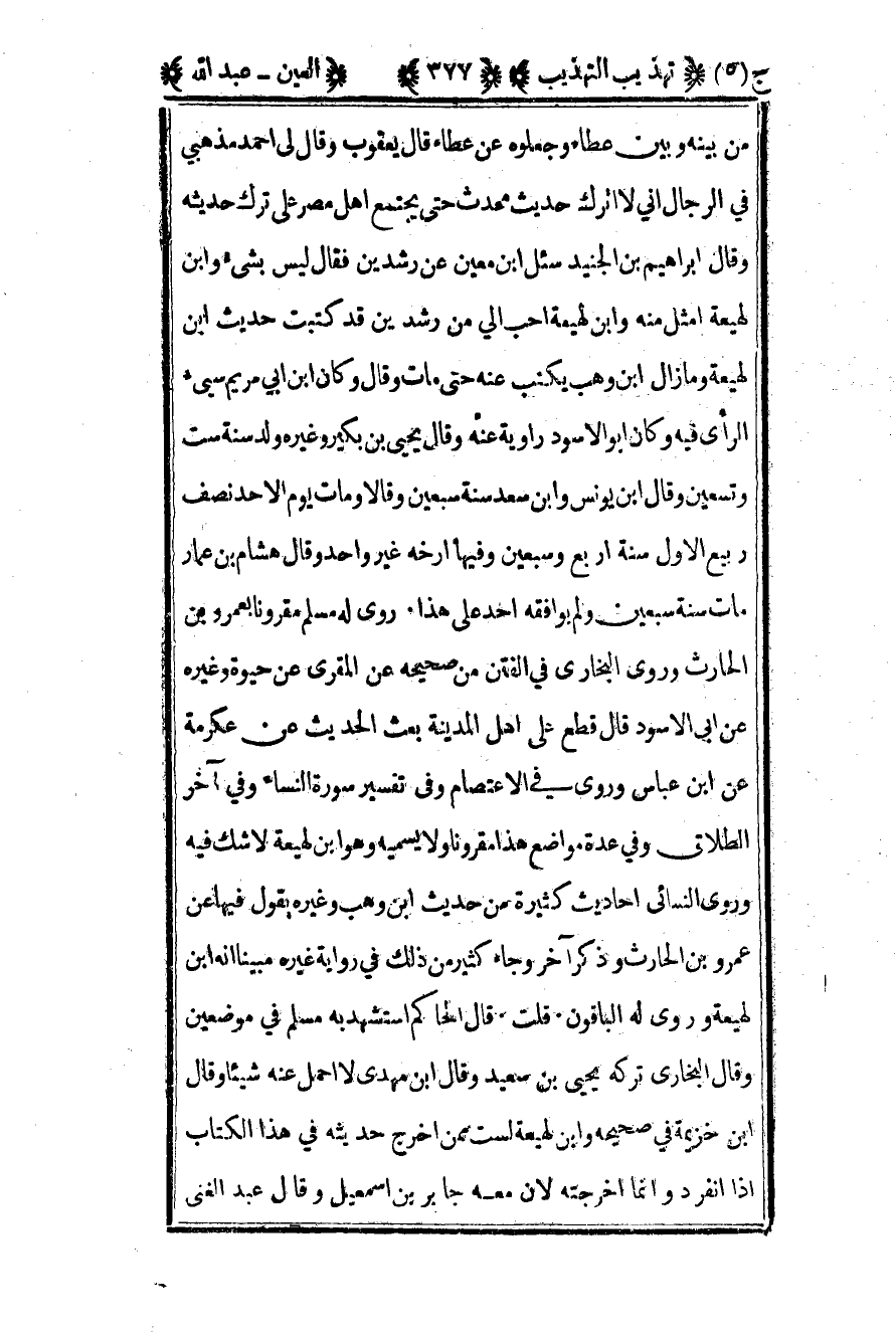 من بينه وبين عطاء وجعلوه عن عطاء قال يعقوب وقال لي أحمد مذهبي في الرجال أني لا أترك حديث محدث حتى يجتمع أهل مصر على ترك حديثه وقال إبراهيم بن الجنيد سئل ابن معين عن رشدين فقال ليس بشيء وابن لهيعة أمثل منه وابن لهيعة أحب إلي من رشدين قد كتبت حديث بن لهيعة وما زال بن وهب يكتب عنه حتى مات وقال وكان بن أبي مريم سيء الرأي فيه وكان أبو الأسود راويه عنه وقال يحيى بن بكير وغيره ولد سنة ست وتسعين وقال ابن يونس وابن سعد سنة سبعين وقالا ومات يوم الأحد نصف ربيع الأول سنة أربع وسبعين وفيها أرخه غير واحد وقال هشام بن عمار مات سنة سبعين ولم يوافقه أحد على هذا روى له مسلم مقرونا بعمرو بن الحارث وروى البخاري في الفتن من صحيحه عن المقري عن حيوة وغيره عن أبي الأسود قال قطع على أهل المدينة بعث الحديث عن عكرمة عن ابن عباس وروى في الاعتصام وفي تفسير سورة النساء وفي آخر الطلاق وفي عدة مواضع هذا مقرونا ولا يسميه وهو ابن لهيعة لا شك فيه وروى النسائي أحاديث كثيرة من حديث بن وهب وغيره يقول فيها عن عمرو بن الحارث وذكر آخر وجاء كثير من ذلك في رواية غيره مبينا أنه بن لهيعة وروى له الباقون قلت قال الحاكم استشهد به مسلم في موضعين وقال البخاري تركه يحيى بن سعيد وقال ابن مهدي لا أحمل عنه شيئا وقال ابن خزيمة في صحيحه وابن لهيعة لست ممن أخرج حديثه في هذا الكتاب إذا انفرد وإنما أخرجته لأن معه جابر بن إسماعيل وقال عبد الغني