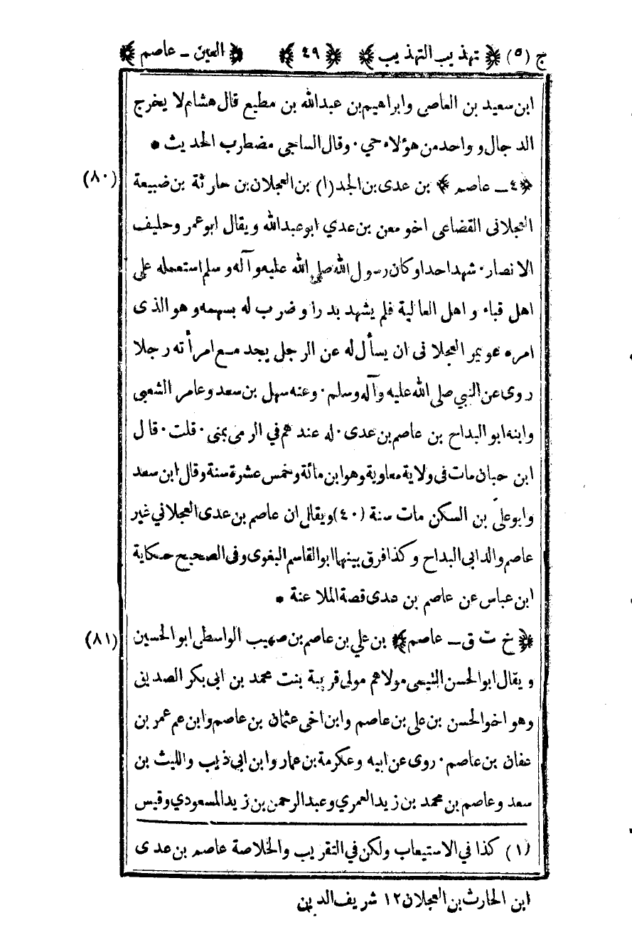 1كذا في الاستيعاب ولكن في التقريب والخلاصة عاصم بن عدي ابن الحارث بن العجلان 12 شريف الدين.