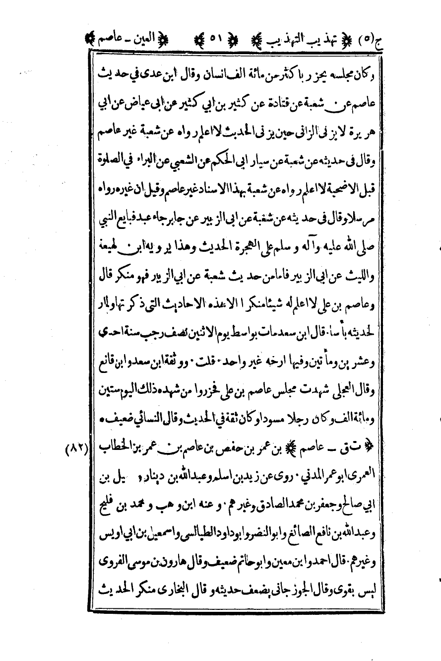 82 - "ت ق - عاصم" بن عمر بن حفص بن عاصم بن عمر بن الخطاب العمري أبو عمر المدني روى عن زيد بن أسلم وعبد الله بن دينار وسهيل بن أبي صالح وجعفر بن محمد الصادق وغيرهم وعنه بن وهب ومحمد بن فليح وعبد الله بن نافع الصائغ وأبو النضر وأبو داود الطيالسي وإسماعيل بن أبي أويس وغيرهم قال أحمد وابن معين وأبو حاتم ضعيف وقال هارون بن موسى الفروي ليس بالقوي وقال الجوزجاني يضعف حديثه وقال البخاري منكر الحديث