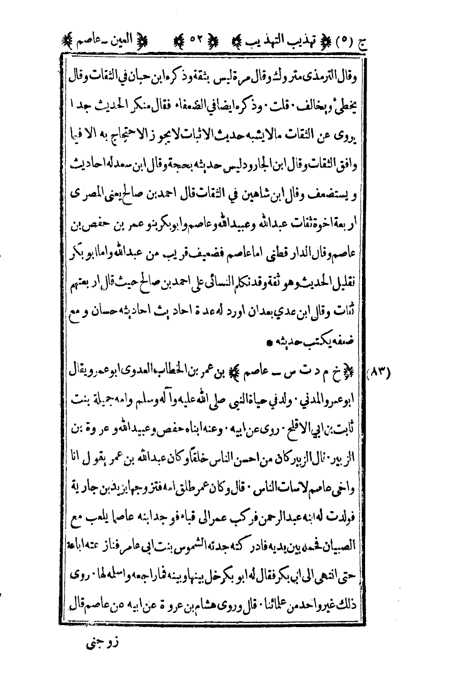 83 - "خ م د ت س - عاصم" بن عمر بن الخطاب العدوي أبو عمر ويقال أبو عمرو المدني ولد في حياة النبي صلى الله عليه وسلم وأمه جميلة بنت ثابت بن أبي الأقلح روى عن أبيه وعنه أبناه حفص وعبيد الله وعروة بن الزبير قال الزبير كان من أحسن الناس خلقا وكان عبد الله بن عمر يقول أنا وأخي عاصم لاسات الناس قال وكان عمر طلق أمه فتزوجها يزيد بن جارية فولدت له ابنه عبد الرحمن فركب عمر إلى قباء فوجد ابنه عاصما يلعب مع الصبيان فحمله بين يديه فأدركته جدته الشموس بنت أبي عامر فنازعته أباه حتى انتهى إلى أبي بكر فقال له أبو بكر خل بينها وبينه فما راجعه وأسلمه لها روى ذلك غير واحد من علمائنا قال وروى هشام بن عروة عن أبيه عن عاصم قال