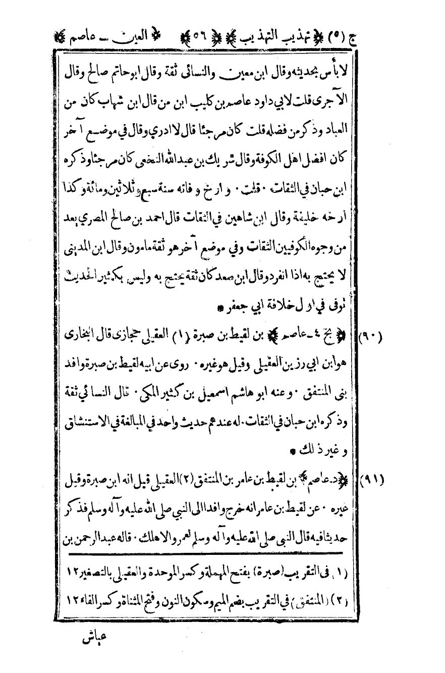 90 - "بخ 4 - عاصم" بن لقيط بن صبرة1 العقيلي حجازي قال البخاري هو ابن أبي رزين العقيلي وقيل هو غيره روى عن أبيه لقيط بن صبرة وافد بني المنتفق وعنه أبو هاشم إسماعيل بن كثير المكي قال النسائي ثقة وذكره ابن حبان في الثقات له عندهم حديث واحد في المبالغة في الاستنشاق وغير ذلك