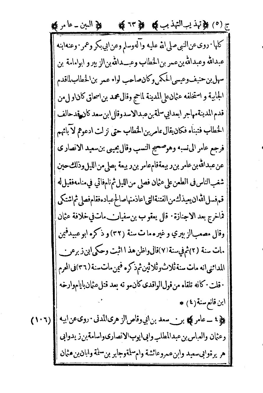 106 - "4 - عامر" بن سعد بن أبي وقاص الزهري المدني روى عن أبيه وعثمان والعباس بن عبد المطلب وأبي أيوب الأنصاري وأسامة بن زيد وأبي هريرة وأبي سعيد وابن عمر وعائشة وأم سلمة وجابر بن سلمة وأبان بن عثمان