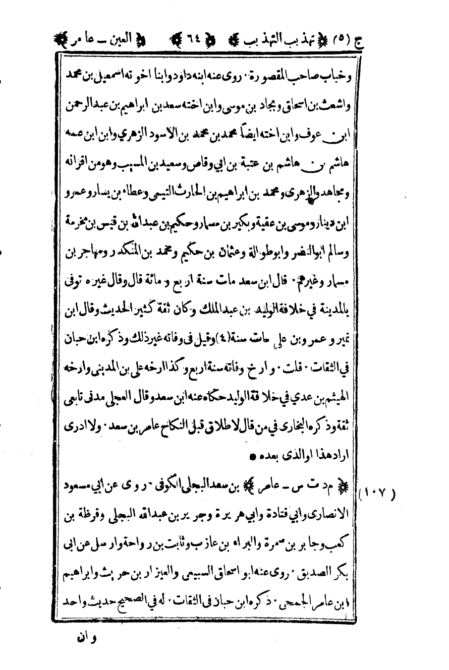 107 - "م د ت س - عامر" بن سعد البجلي الكوفي روى عن أبي مسعود الأنصاري وأبي قتادة وأبي هريرة وجرير بن عبد الله البجلي وقرظة بن كعب وجابر بن سمرة والبراء بن عازب وثابت بن رواحة وأرسل عن أبي بكر الصديق روى عنه أبو إسحاق السبيعي والعيزار بن حريث وإبراهيم بن عامر الجمحي ذكره ابن حبان في الثقات له في الصحيح حديث واحد