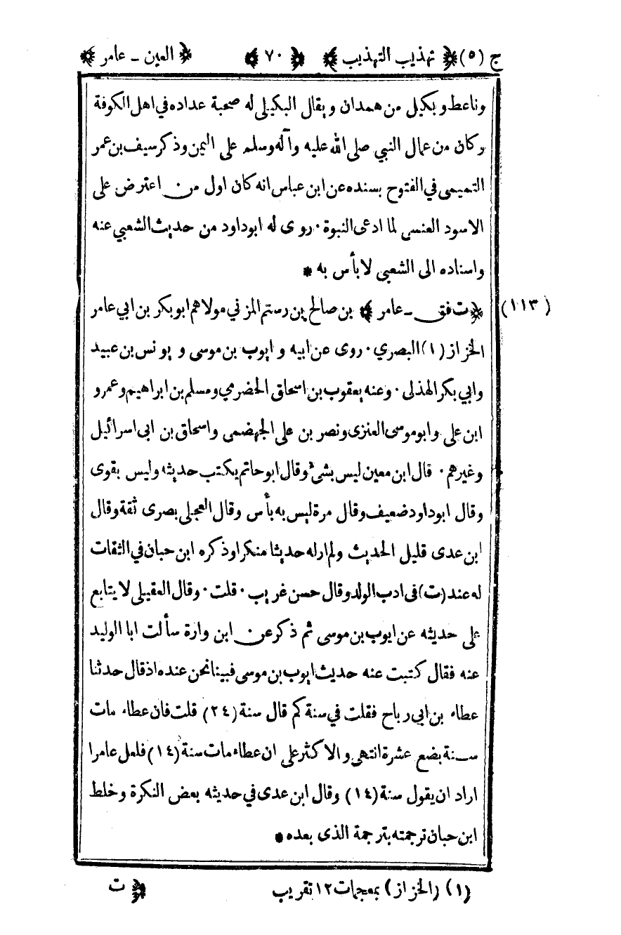 113 - "ت فق - عامر" بن صالح بن رستم المزني مولاهم أبو بكر بن أبي عامر الخزاز1 البصري روى عن أبيه وأيوب بن موسى ويونس بن عبيد وأبي بكر الهذلي وعنه يعقوب بن إسحاق الحضرمي ومسلم بن إبراهيم وعمرو بن علي وأبو موسى العنزي ونصر بن علي الجهضمي وإسحاق بن أبي إسرائيل وغيرهم قال ابن معين ليس بشيء وقال أبو حاتم يكتب حديثه وليس بقوي وقال أبو داود ضعيف وقال مرة ليس به بأس وقال العجلي بصري ثقة وقال ابن عدي قليل الحديث ولم أر له حديثا منكرا وذكره ابن حبان في الثقات له عند ت في أدب الولد وقال حسن غريب قلت وقال العقيلي لا يتابع على حديثه عن أيوب بن موسى ثم ذكر عن ابن وارة سألت أبا الوليد عنه فقال كتبت عنه حديث أيوب بن موسى فينا نحن عنده إذ قال حدثنا عطاء بن أبي رباح فقلت في سنة كم قال سنة (24) قلت فإن عطاء مات سنة بضع عشرة انتهى والأكثر على أن عطاء مات سنة (14) فلعل عامرا أراد أن يقول سنة (14) وقال ابن عدي في حديثه بعض النكرة وخلط بن حبان ترجمته بترجمة الذي بعده