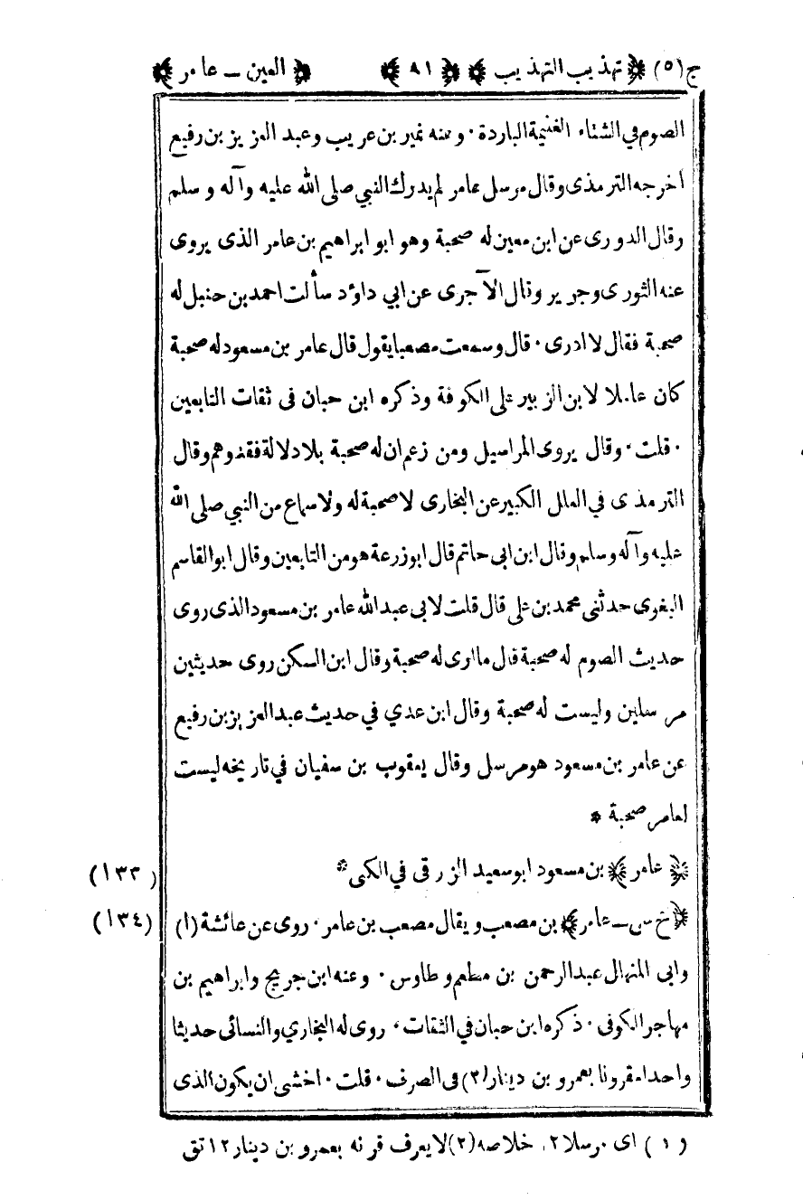 134 - "خ سي - عامر" بن مصعب ويقال مصعب بن عامر روى عن عائشة1 وأبي المنهال عبد الرحمن بن مطعم وطاووس وعنه بن جريج وإبراهيم بن مهاجر الكوفي ذكره ابن حبان في الثقات روى له البخاري والنسائي حديثا واحدا مقرونا بعمرو بن دينار2 في الصرف قلت أخشى أن يكون الذي