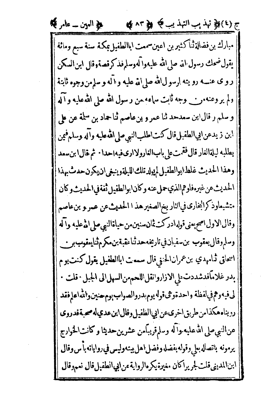 مبارك بن فضالة ثنا كثير بن أعين سمعت أبا الطفيل بمكة سنة سبع ومائة يقول ضحك رسول الله صلى الله عليه وسلم فذكر قصة وقال ابن السكن روى عنه روايته لرسول الله صلى الله عليه وسلم من وجوه ثابتة ولم يرو عنه من وجه ثابت سماعه من رسول الله صلى الله عليه وسلم وقال ابن سعد حدثنا عمرو بن عاصم ثنا حماد بن سلمة عن علي بن زيد عن أبي الطفيل قال كنت أطلب النبي صلى الله عليه وسلم فيمن يطلبه ليلة الغار قال فقمت على باب الغار ولا أرى فيه أحدا ثم قال ابن سعد وهذا الحديث غلط أبو الطفيل لم يولد تلك الليلة وينبغي أن يكون حدث بهذا الحديث عن غيره فأوهم الذي حمل عنه وكان أبو الطفيل ثقة في الحديث وكان متشيعا وذكر البخاري في التاريخ الصغير هذا الحديث عن عمرو بن عاصم وقال الأول أصح يعني قوله أدركت ثمان سنين من حياة النبي صلى الله عليه وسلم وقال يعقوب بن سفيان في تاريخه حدثنا عقبة بن مكرم ثنا يعقوب بن إسحاق ثنا مهدي بن عمران الحنفي قال سمعت أبا الطفيل يقول كنت يوم بدر غلاما قد شددت علي الإزار وانقل اللحم من السهل إلى الجبل قلت لي فيه وهم في لفظه واحدة وهي قوله يوم بدر والصواب يوم حنين والله أعلم فقد رويناه هكذا من طريق أخرى عن أبي الطفيل وقال ابن عدي له صحبة قد روى عن النبي صلى الله عليه وسلم قريبا من عشرين حديثا وكانت الخوارج يرمونه باتصاله بعلي وقوله بفضله وفضل أهل بيته وليس في رواياته بأس وقال ابن المديني قلت لجرير أكان مغيرة يكره الرواية عن أبي الطفيل قال نعم وقال