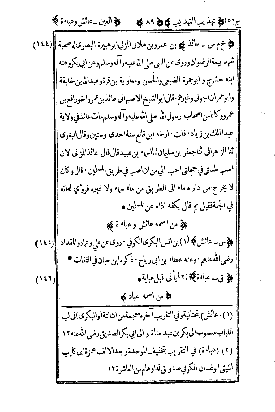 144 - "خ م س – عائذ" بن عمرو بن هلال المزني أبو هبيرة البصري له صحبة شهد بيعة الرضوان وروى عن النبي صلى الله عليه وسلم وعن أبي بكر وعنه ابنه حشرج وأبو جمرة الضبعي والحسن ومعاوية بن قرة وعبد الله بن خليفة وأبو عمران الجوني وغيرهم قال أبو الشيخ الأصبهاني عائذ بن عمر وأخو رافع بن عمرو وكانا من أصحاب رسول الله صلى الله عليه وسلم مات عائذ في ولاية عبد الملك بن زياد قلت أرخه بن قانع سنة إحدى وستين وقال البغوي ثنا الزهراني ثنا جعفر بن سليمان ثنا أسماء بن عبيد قال قال عائذ المزني لأن أصب طستي في حجلتي أحب إلي من أن أصب في طريق المسلمين قال وكان لا يخرج من داره ماء إلى الطريق من ماء سماء ولا غيره فرؤي له أنه في الجنة فقيل بم قال بكفه اذاه عن المسلمين