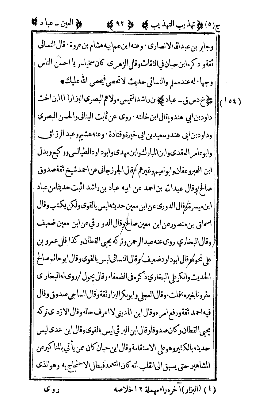 154 - "خ د س ق – عباد" بن راشد التميمي مولاهم البصري البزار1 بن أخت داود بن أبي هند ويقال ابن خالته روى عن ثابت البناني والحسن البصري وداود بن أبي هند وسعيد بن أبي خيرة وقتادة وعنه هشيم وعبد الرزاق وأبو عامر العقدي وابن المبارك وابن مهدي وأبو داود الطيالسي ووكيع وبدل بن المحبر وعفان وأبو نعيم وغيرهم قال الجوزجاني عن أحمد شيخ ثقة صدوق صالح وقال عبد الله بن أحمد عن أبيه عباد بن راشد أثبت حديثا من عباد بن ميسرة وقال الدوري عن ابن معين حديثه ليس بالقوي ولكن يكتب وقال إسحاق بن منصور عن ابن معين صالح وقال الدورقي عن ابن معين ضعيف وقال البخاري روى عنه عبد الرحمن وتركه يحيى القطان وكذا قال عمرو بن علي نحوه وقال أبو داود ضعيف وقال النسائي ليس بالقوي وقال أبو حاتم صالح الحديث وأنكر على البخاري ذكره في الضعفاء وقال يحول روى له البخاري مقرونا بغيره قلت وقال العجلي وأبو بكر البزار ثقة وقال الساجي صدوق وقال فيه أحمد ثقة ورفع أمره وقال ابن المديني لا أعرف حاله وقال الأزدي تركه يحيى القطان وكان صدوقا وقال ابن البرقي ليس بالقوي وقال ابن عدي ليس حديثه بالكثير وهو على الاستقامة وقال ابن حبان كان ممن يأتي بالمناكير عن المشاهير حتى يسبق إلى القلب أنه كان المتعمد فبطل الاحتجاج به وهو الذي