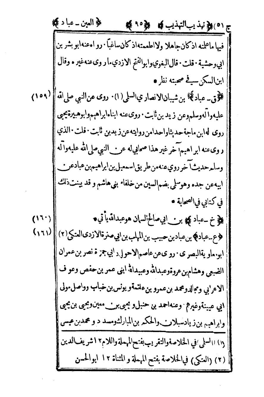 159 - "ق - عباد" بن شيبان الأنصاري السلمي1 روى عن النبي صلى الله عليه وسلم وعن زيد بن ثابت روى عنه ابناه إبراهيم وأبو هبيرة يحيى روى له بن ماجة حديثا واحدا من روايته عن زيد بن ثابت قلت الذي روى عنه إبراهيم آخر غير هذا صحابي له عن النبي صلى الله عليه وسلم حديث آخر روى عنه من طريق إسماعيل بن إبراهيم بن عباد عن أبيه عن جده وهو سلمي بضم السين من خلفاء بني هاشم وقد بينت ذلك في كتابي في الصحابة.