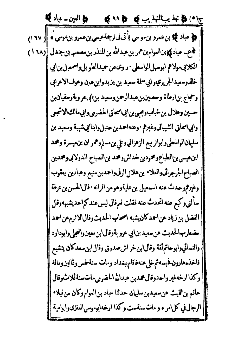 168 - "ع - عباد" بن العوام بن عبد الله بن المنذر بن مصعب بن جندل الكلابي مولاهم أبو سهل الواسطي روى عن حميد الطويل وإسماعيل بن أبي خالد وسعيد الجريري وأبي سلمة سعيد بن يزيد وابن عوف الأعرابي وحجاج بن أرطاة وحصين بن عبد الرحمن وسعيد بن أبي عروبة وسفيان بن حسين وهلال بن خباب ويحيى بن أبي إسحاق الحضرمي وأبي مالك الأشجعي وأبي إسحاق الشيباني وغيرهم وعنه أحمد بن حنبل وابنا أبي شيبة وسعيد بن سليمان الواسطي وأبو الربيع الزهراني وعلي بن مسلم وعمران بن ميسرة ومحمد بن عيسى بن الطباع ومحمود بن خداش ومحمد بن الصباح الدولابي ومحمد بن الصباح الجرجرائي والعلاء بن هلال الرقي وأحمد بن منيع وعباد بن يعقوب وغيرهم وحدث عنه إسماعيل بن علية وهو من أقرانه قال الحسن بن عرفة سألني وكيع عنه أتحدث عنه فقلت نعم قال ليس عندكم أحد يشبهه وقال الفضل بن زياد عن أحمد كان يشبه أصحاب الحديث وقال الأثرم عن أحمد مضطرب الحديث عن سعيد بن أبي عروبة وقال ابن معين والعجلي وأبو داود والنسائي وأبو حاتم ثقة وقال ابن خراش صدوق وقال ابن سعد كان يتشيع فأخذه هارون فحبسه ثم خلى عنه فأقام ببغداد ومات سنة خمس وثمانين ومائة وكذا أرخه غير واحد وقال محمد بن عبد الله الحضرمي مات سنة ثلاث وقال حاتم بن الليث عن سعيد بن سليمان حدثنا عباد بن العوام وكان من نبلاء الرجال في كل أمره ومات سنة ست وكذا أرخه أبو موسى العنزي وأبو أمية