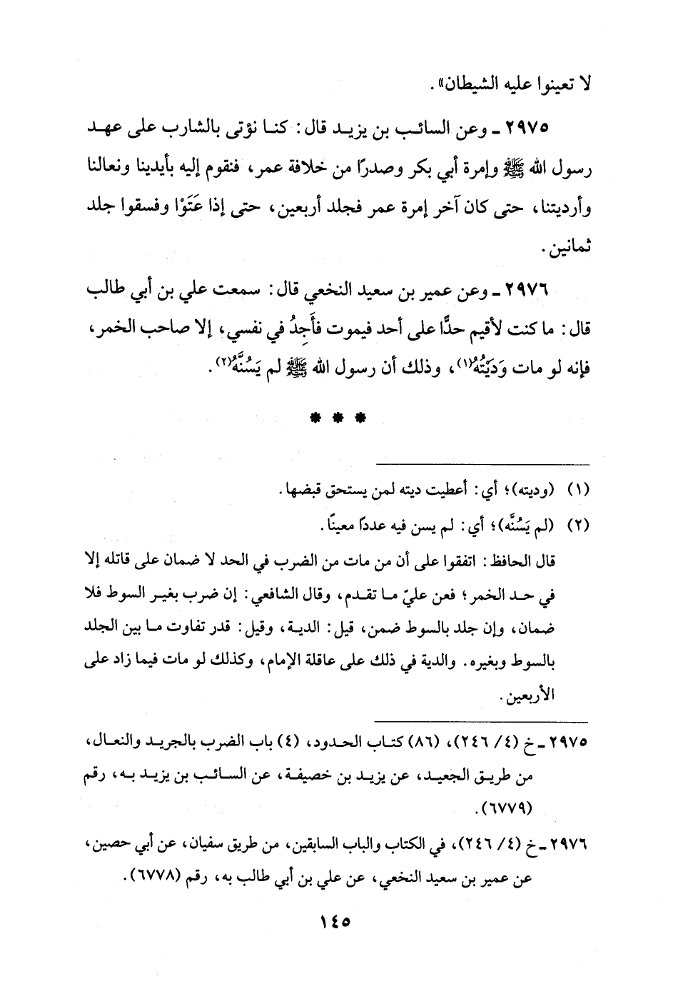2975 - وعن السائب بن يزيد قال: كنا نؤتى بالشارب على عهد رسول اللَّه -صلى اللَّه عليه وسلم- وإمرة أبي بكر وصدرًا من خلافة عمر، فنقوم إليه بأيدينا ونعالنا وأرديتنا، حتى كان آخر إمرة عمر فجلد أربعين، حتى إذا عَتَوْا وفسقوا جلد ثمانين.