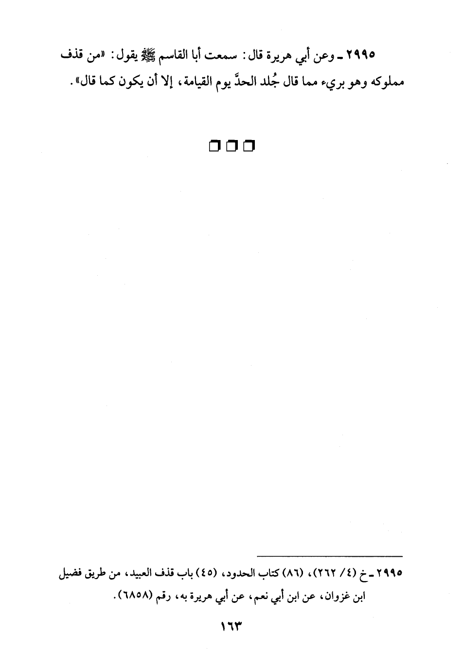 2995 - وعن أبي هريرة قال: سمعت أبا القاسم -صلى اللَّه عليه وسلم- يقول: "من قذف مملوكه وهو بريء مما قال جُلد الحدَّ يوم القيامة، إلا أن يكون كما قال".