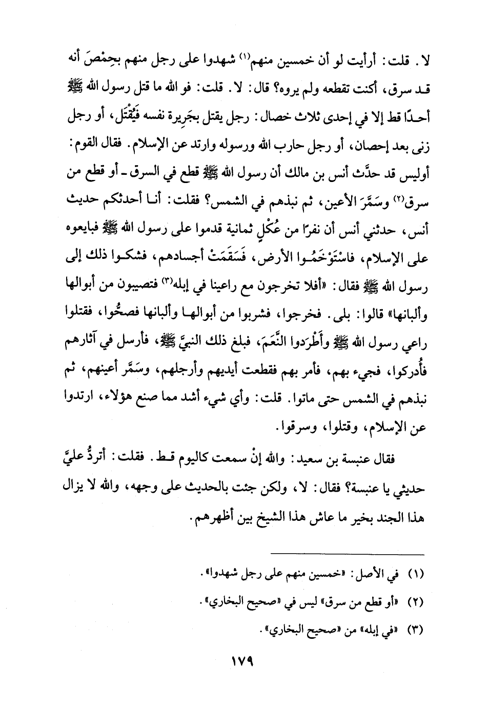 لا. قلت: أرأيت لو أن خمسين منهم (¬1) شهدوا على رجل منهم بحِمْصَ أنه قد سرق، كنت تقطعه ولم يروه؟ قال: لا. قلت: فواللَّه ما قتل رسول اللَّه -صلى اللَّه عليه وسلم- أحدًا قط إلا في إحدى ثلاث خصال: رجل يقتل بجَرِيرة نفسه فَيُقْتَل، أو رجل زنى بعد إحصان، أو رجل حارب اللَّه ورسوله وارتد عن الإسلام. فقال القوم: أوليس قد حدَّث أنس بن مالك أن رسول اللَّه -صلى اللَّه عليه وسلم- قطع في السرق -أو قطع من سرق (¬2) وسَمَّرَ الأعين، ثم نبذهم في الشمس؟ فقلت: أنا أحدثكم حديث أنس، حدثني أنس أن نفرًا من عُكْلٍ ثمانية قدموا على رسول اللَّه -صلى اللَّه عليه وسلم- فبايعوه على الإسلام، فاسْتَوْخَمُوا الأرض، فَسَقَمَتْ أجسادهم، فشكوا ذلك إلى رسول اللَّه -صلى اللَّه عليه وسلم-: "أفلا تخرجون مع راعينا في إبله (¬3) فتصيبون من أبوالها وألبانها" قالوا: بلى. فخرجوا، فشربوا من أبوالها وألبانها فصحُّوا، فقتلوا راعي رسول اللَّه -صلى اللَّه عليه وسلم- وأَطْرَدوا النَّعَمَ، فبلغ ذلك النبي -صلى اللَّه عليه وسلم-، فأرسل في آثارهم فأُدركوا، فجيء بهم، فأمر بهم فقطعت أيديهم وأرجلهم، وسَمَّر أعينهم، ثم نبذهم في الشمس حتى ماتوا. قلت: وأي شيء أشد مما صنع هؤلاء، ارتدوا عن الإسلام، وقتلوا، وسرقوا.