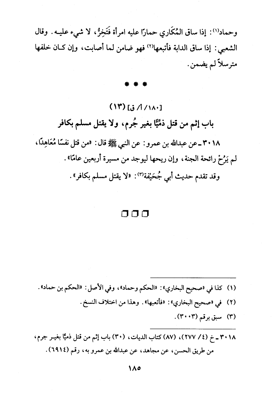 (13) باب إثم من قتل ذمِّيًّا بغير جُرم، ولا يقتل مسلم بكافر