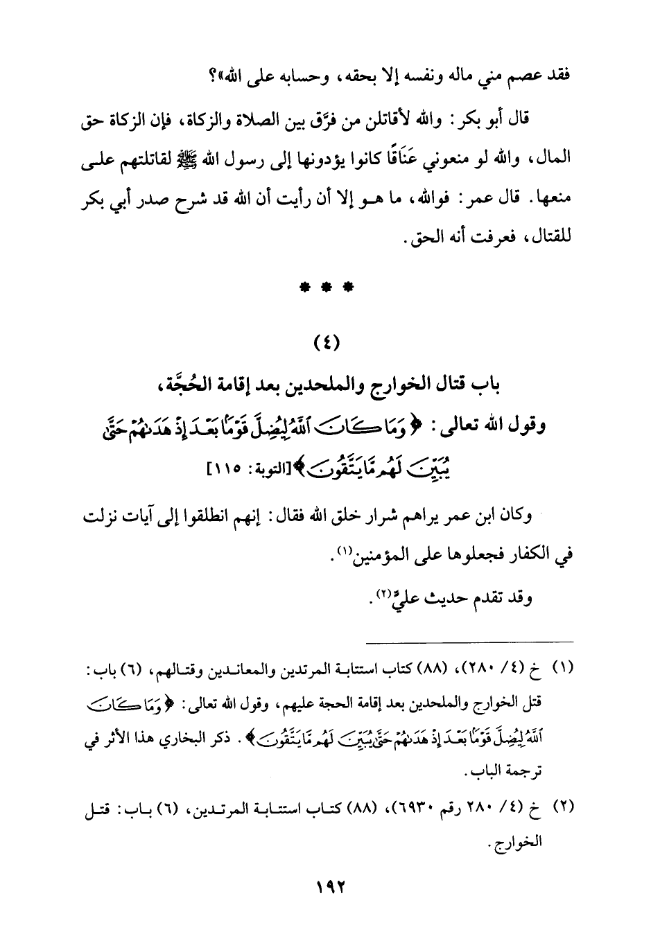 (4) باب قتال الخوارج والملحدين بعد إقامة الحُجَّة، وقول اللَّه تعالى: {وَمَا كَانَ اللَّهُ لِيُضِلَّ قَوْمًا بَعْدَ إِذْ هَدَاهُمْ حَتَّى يُبَيِّنَ لَهُمْ مَا يَتَّقُونَ} [التوبة: 115]