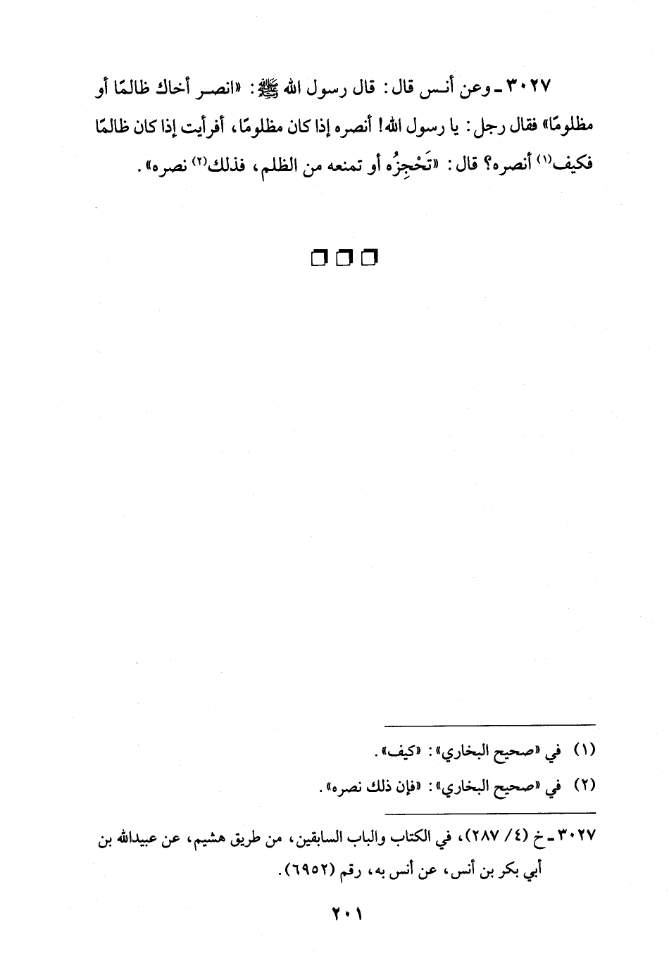 3027 - وعن أَنس قال: قال رسول اللَّه -صلى اللَّه عليه وسلم-: "انصر أخاك ظالمًا أو مظلومًا" فقال رجل: يا رسول اللَّه! أنصره إذا كان مظلومًا، أفرأيت إذا كان ظالمًا فكيف (¬1) أنصره؟ قال: "تَحْجِزُه أو تمنعه من الظلم، فذلك (¬2) نصره".