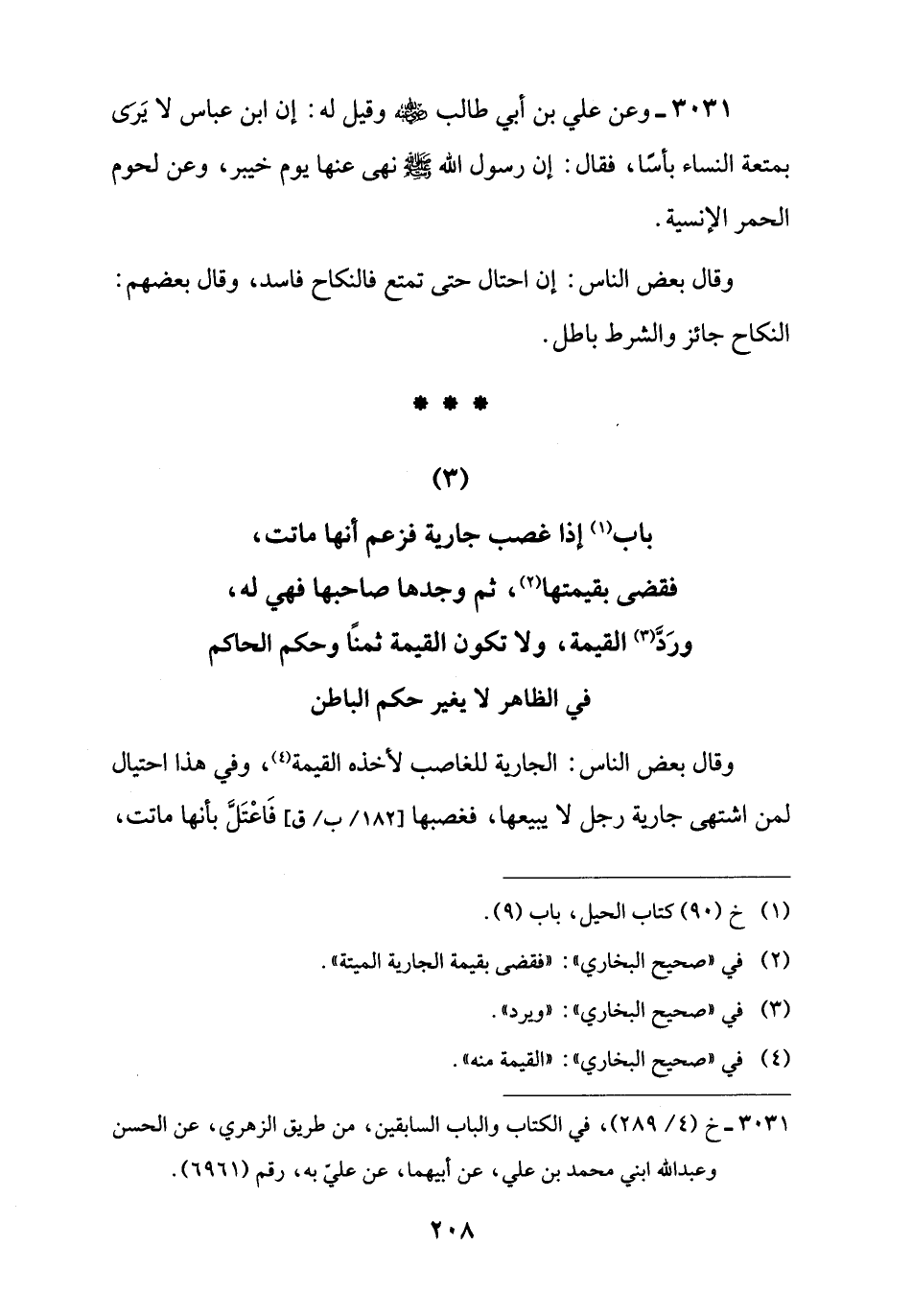 3031 - وعن علي بن أبي طالب -رضي اللَّه عنه- وقيل له: إن ابن عباس لا يَرَى بمتعة النساء بأسًا، فقال: إن رسول اللَّه -صلى اللَّه عليه وسلم- نهى عنها يوم خيبر، وعن لحوم الحمر الإنسية.