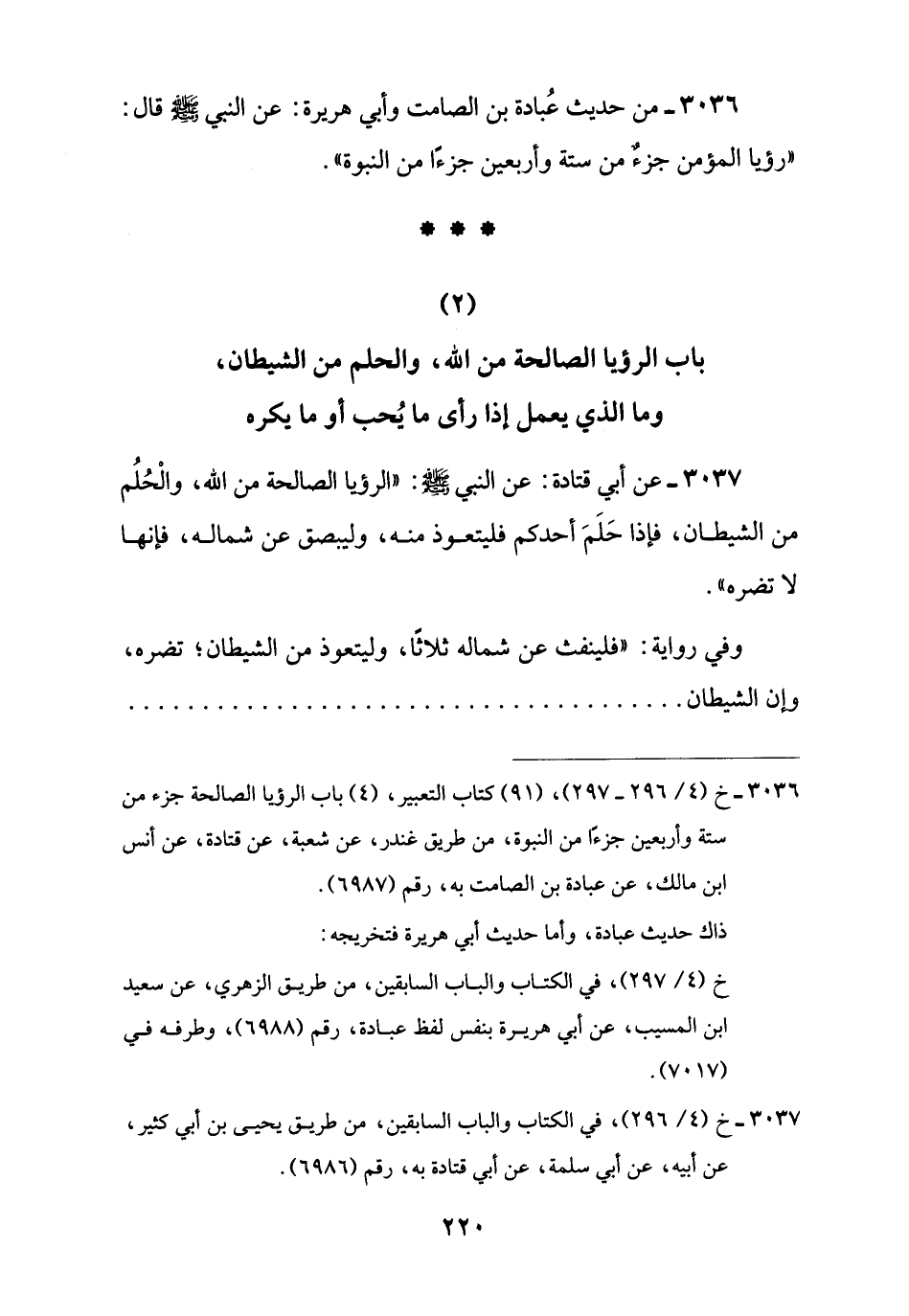 3036 - خ (4/ 296 - 297)، (91) كتاب التعبير، (4) باب الرؤيا الصالحة جزء من ستة وأربعين جزءًا من النبوة، من طريق غندر، عن شعبة، عن قتادة، عن أَنس ابن مالك، عن عبادة بن الصامت به، رقم (6987).