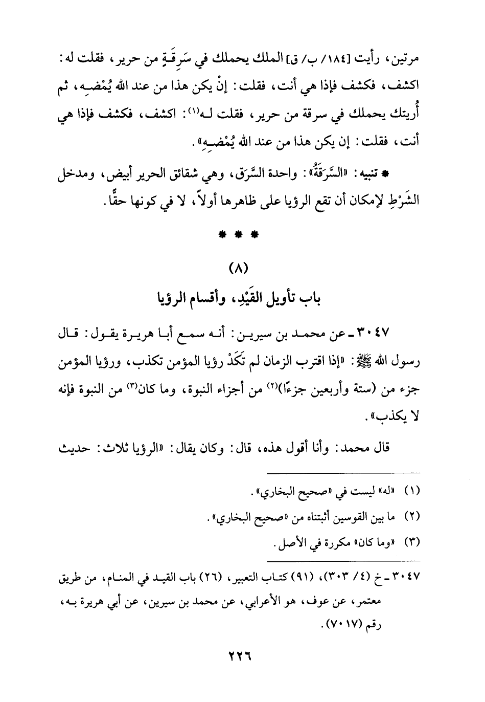 * تنبيه: "السَّرَقَةُ": واحدة السَّرَق، وهي شقائق الحرير أبيض، ومدخل الشَرْطِ لإمكان أن تقع الرؤيا على ظاهرها أولًا، لا في كونها حقًا.