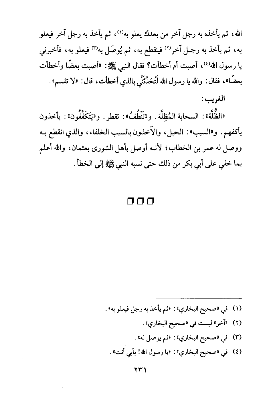 "الظُّلَّة": السحابة المُظِلَّة. و"تَنْطُفُ": تقطر. و"يَتَكَفَّفُون": يأخذون بأكفهم. و"السبب": الحبل، والآخذون بالسبب الخلفاء، والذي انقطع به ووصل له عمر بن الخطاب؛ لأنه أوصل بأهل الشورى بعثمان، واللَّه أعلم بما خفي على أبي بكر من ذلك حتى نسبه النبي -صلى اللَّه عليه وسلم- إلى الخطأ.