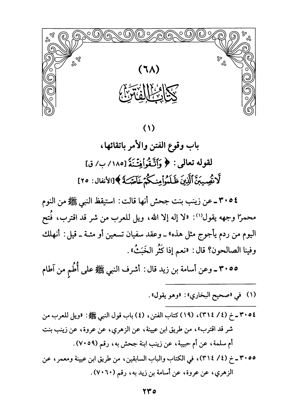 (1) باب وقوع الفتن والأمر باتقائها، لقوله تعالى: {وَاتَّقُوا فِتْنَةً لَا تُصِيبَنَّ الَّذِينَ ظَلَمُوا مِنْكُمْ خَاصَّةً} [الأنفال: 25]