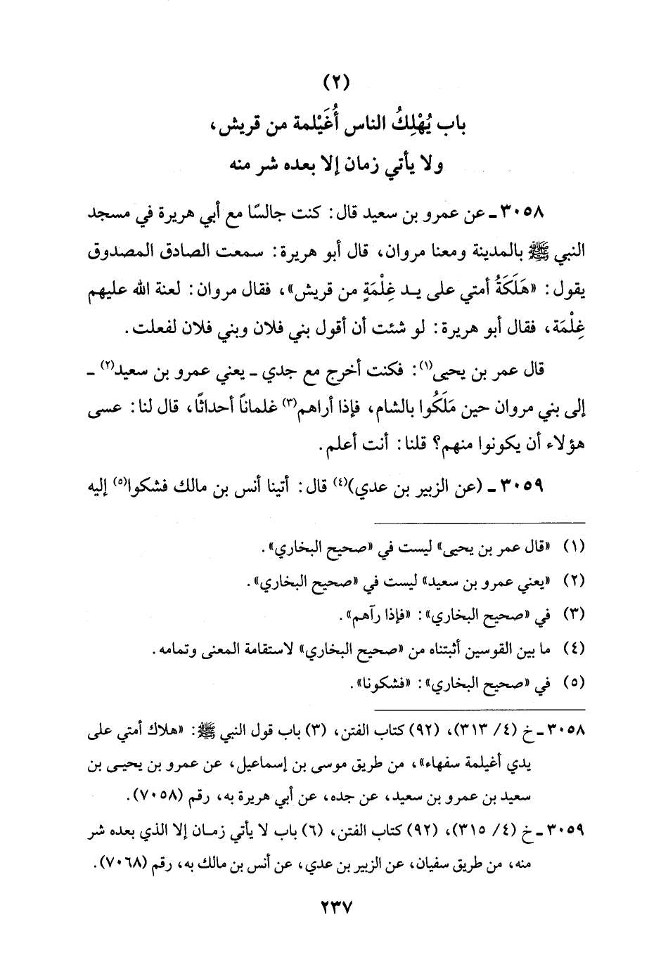 3058 - خ (4/ 313)، (92) كتاب الفتن، (3) باب قول النبي -صلى اللَّه عليه وسلم-: "هلاك أمتي على يدي أغيلمة سفهاء"، من طريق موسى بن إسماعيل، عن عمرو بن يحيى بن سعيد بن عمرو بن سعيد، عن جده، عن أبي هريرة به، رقم (7058).