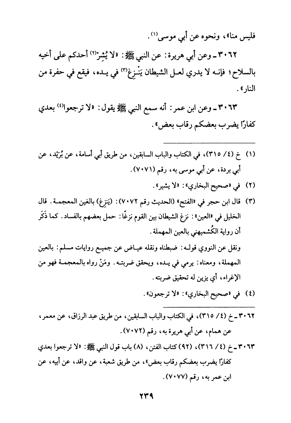 3062 - وعن أبي هريرة: عن النبي -صلى اللَّه عليه وسلم-: "لا يُشِرْ (¬2) أحدكم على أخيه بالسلاح؛ فإنه لا يدري لعل الشيطان يَنْزِغ (¬3) في يده، فيقع في حفرة من النار".