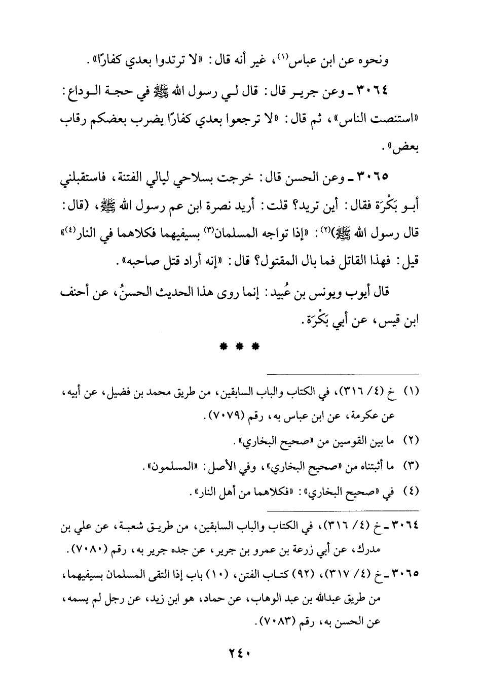 3064 - وعن جرير قال: قال لي رسول اللَّه -صلى اللَّه عليه وسلم- في حجة الوداع: "استنصت الناس"، ثم قال: "لا ترجعوا بعدي كفارًا يضرب بعضكم رقاب بعض".