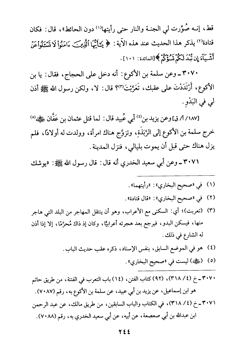 3070 - خ (4/ 318)، (92) كتاب الفتن، (14) باب التعرب في الفتنة، من طريق حاتم هو ابن إسماعيل، عن يزيد بن أبي عبيد، عن سلمة بن الأكوع به، رقم (7087).