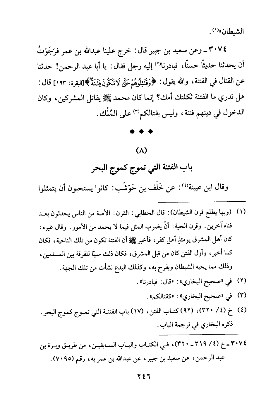 3074 - وعن سعيد بن جبير قال: خرج علينا عبد اللَّه بن عمر فرَجَوْتُ أن يحدثنا حديثًا حسنًا، فبادرنا (¬2) إليه رجل فقال: يا أبا عبد الرحمن! حدثنا عن القتال في الفتنة، واللَّه يقول: {وَقَاتِلُوهُمْ حَتَّى لَا تَكُونَ فِتْنَةٌ} [البقرة: 193] قال: هل تدري ما الفتنة ثكلتك أمك؟ إنما كان محمد -صلى اللَّه عليه وسلم- يقاتل المشركين، وكان الدخول في دينهم فتنة، وليس بقتالكم (¬3) على المُلْك.