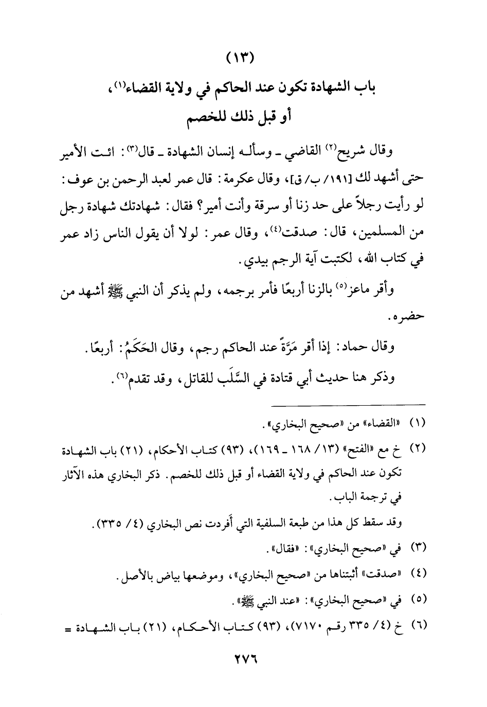 (¬2) خ مع "الفتح" (13/ 168 - 169)، (93) كتاب الأحكام، (21) باب الشهادة تكون عند الحاكم في ولاية القضاء أو قبل ذلك للخصم. ذكر البخاري هذه الآثار في ترجمة الباب.