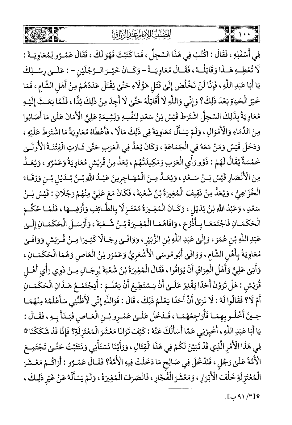 وَكَانَ يُعَدُّ فِي الْعَرَبِ، حَتَّى ثَارَتِ الْفِتْنَةُ الأُولَى، خَمْسَةٌ، يُقَالُ لَهُمْ: ذَوُو رَأْيِ الْعَرَبِ وَمَكِيدَتُهُمْ، يُعَدُّ مِنْ قُرَيْشٍ: مُعَاوِيَةُ، وَعَمْرٌو، وَيُعَدُّ مِنَ الأَنْصَارِ: قَيْسُ بن سَعْدٍ، وَيُعَدُّ مِنَ المُهَاجِرِينَ: عَبدُ اللهِ بن بُدَيْلِ بْنِ وَرْقَاءَ الْخُزَاعِيُّ، وَيُعَدُّ مِنْ ثَقِيفَ: المُغِيرَةُ بن شُعْبَةَ، فَكَانَ مَعَ عَلِيٍّ مِنْهُمْ رَجُلاَنِ: قَيْسُ بن سَعْدٍ، وَعَبْدُ اللهِ بن بُدَيْلٍ، وَكَانَ المُغِيرَةُ مُعْتَزِلاً بِالطَّائِفِ وَأَرْضِهَا، فَلَمَّا حُكِّمَ الْحَكَمَانِ، فَاجْتَمَعَا بِأَذْرُحَ، وَافَاهُمَا المُغِيرَةُ بن شُعْبَةَ، وَأَرْسَلَ الْحَكَمَانِ إِلَى عَبدِ اللهِ بْنِ عُمَرَ، وَإِلَى عَبدِ اللهِ بْنِ الزُّبَيْرِ، وَوَافَى رِجَالاً كَثِيرًا (1) مِنْ قُرَيْشٍ، وَوَافَى مُعَاوِيَةُ بِأَهْلِ الشَّامِ، وَوَافَى أَبو مُوسَى الأَشْعَرِيُّ، وَعَمْرُو بن الْعَاصِ، وَهُمَا الْحَكَمَانِ، وَأَبَى عَلِيٌّ وَأَهْلُ الْعِرَاقِ أَنْ يُوَافُوا، فَقَالَ المُغِيرَةُ بن شُعْبَةَ لِرِجَالٍ مِنْ ذَوِي رَأْيِ أَهْلِ قُرَيْشٍ: هَلْ تَرَوْنَ أَحَدًا يَقْدِرُ عَلَى أَنْ يَسْتَطِيعَ أَنْ يَعْلَمَ: أَيَجْتَمِعُ هَذَانِ الْحَكَمَانِ أَمْ لاَ؟ فَقَالُوا لَهُ: لاَ نَرَى أَنَّ أَحَدًا يَعْلَمُ ذَلِكَ، قَالَ: فَوَاللهِ إِنِّي لأَظُنُّنِي سَأَعْلَمُهُ مِنْهُمَا حِينَ أَخْلُو بِهِمَا، فَأُرَاجِعُهُمَا، فَدَخَلَ عَلَى عَمْرِو بنِ الْعَاصِ فَبَدَأَ بِهِ