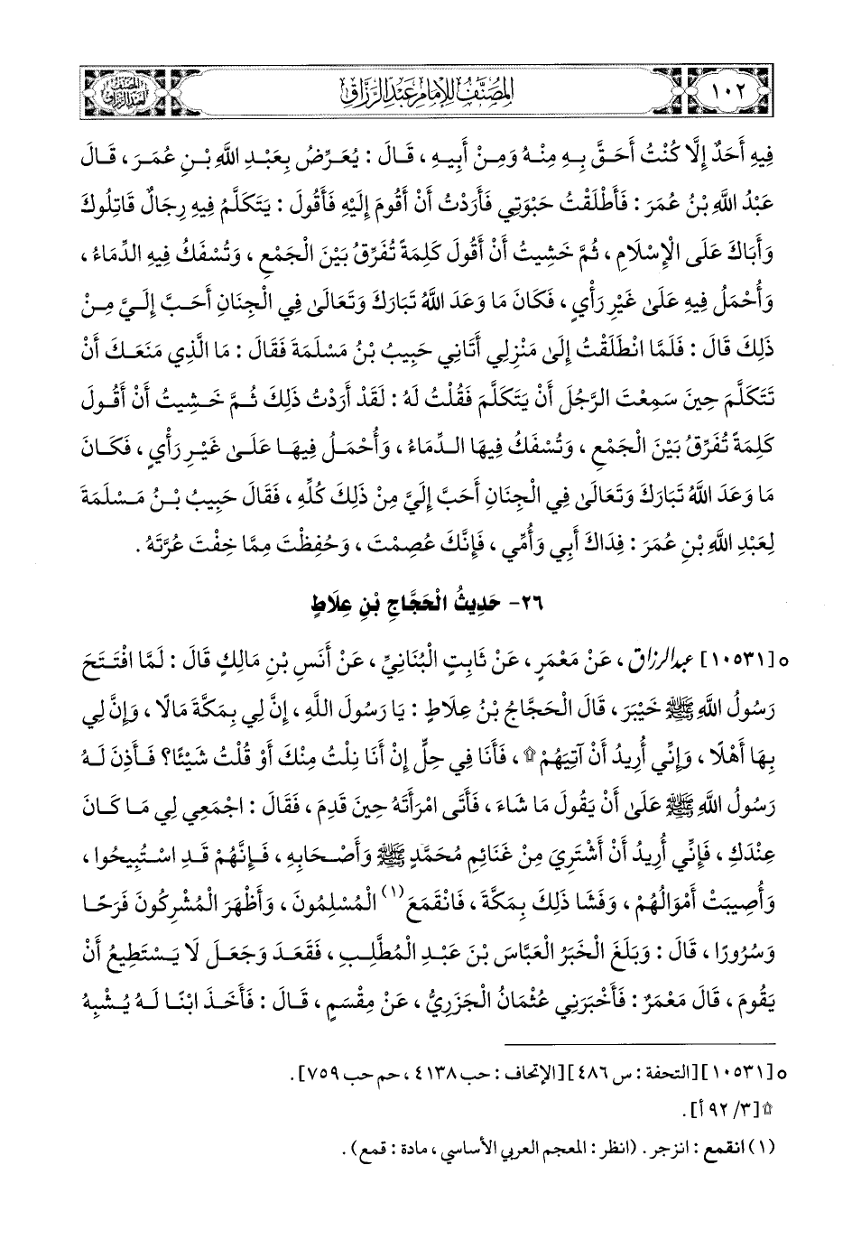 10531- عبد الرزاق، عَنْ مَعْمَرٍ، عَن ثَابِتٍ الْبُنَانِيِّ، عَنْ أَنَسِ بْنِ مَالِكٍ قَالَ: لَمَّا افْتَتَحَ رَسُولُ اللهِ صَلَّى اللهُ عَلَيْهِ وَسَلَّمَ خَبِيرَ، قَالَ الْحَجَّاجُ بن عِلاَطٍ: يَا رَسُولَ اللهِ، إِنَّ لِي بِمَكَّةَ مَالاً، وَإِنَّ لِي بِهَا أَهْلاً، وَإِنِّي أُرِيدُ أَنْ آتِيَهُمْ، فَأَنَا فِي حَلٍّ إِنْ أَنَا نِلْتُ مِنْكَ، أَوْ قُلْتُ شَيْئًا؟ فَأَذِنَ لَهُ رَسُولُ اللهِ صَلَّى اللهُ عَلَيْهِ وَسَلَّمَ عَلَى أَنْ يَقُولَ مَا شَاءَ، فَأَتَى امْرَأَتَهُ حِينَ قَدِمَ، فَقَالَ: اجْمَعِي لِي مَا كَانَ عِنْدَكِ، فَإِنِّي أُرِيدُ أَنْ أَشْتَرِيَ مِنْ غَنَائِمِ مُحَمَّدٍ صَلَّى اللهُ عَلَيْهِ وَسَلَّمَ وَأَصْحَابِهِ،