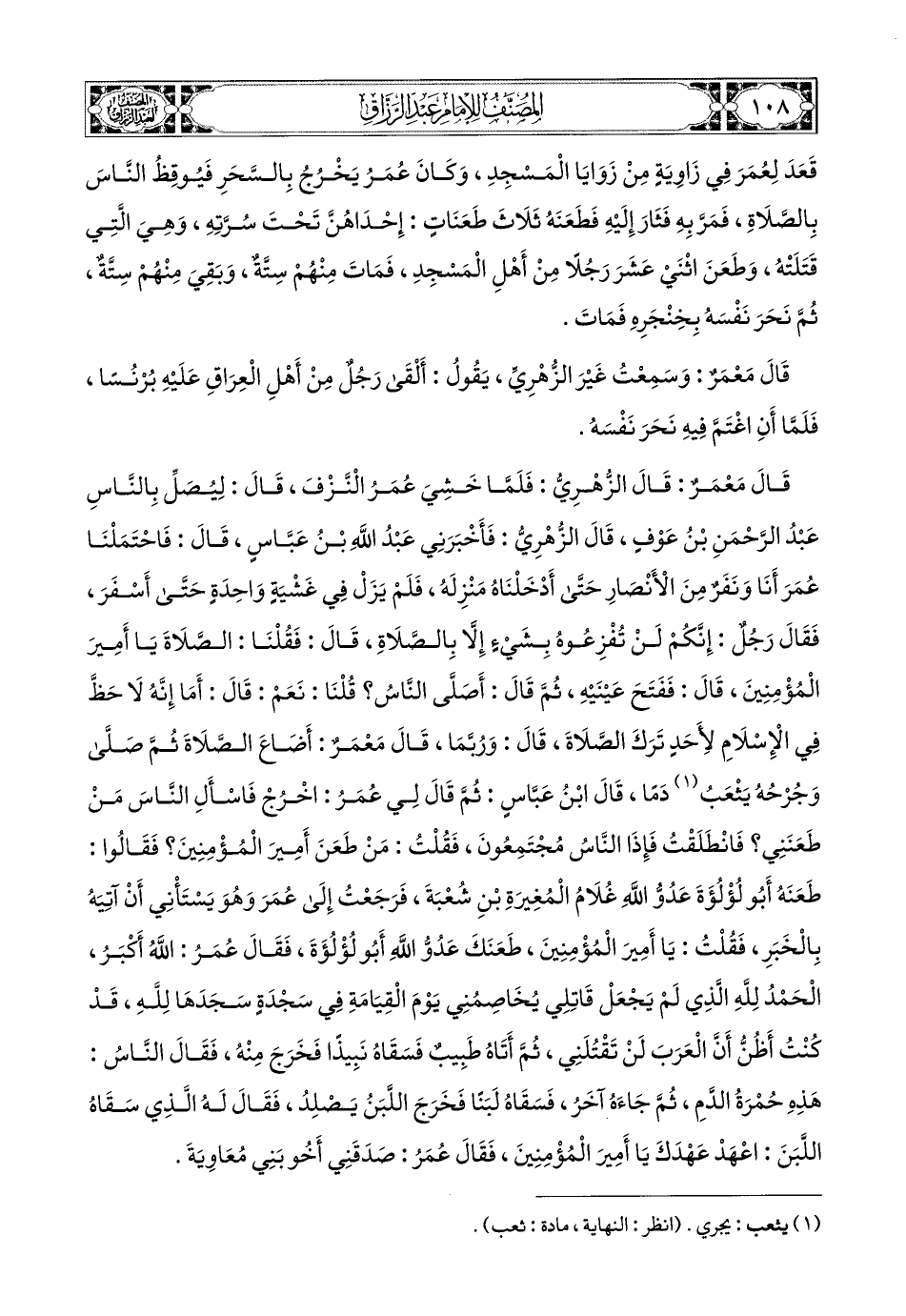 قَالَ الزُّهْرِيُّ: فَأَخْبَرَنِي عَبدُ اللهِ بن عَبَّاسٍ، قَالَ: فَاحْتَمَلْنَا عُمَرَ أَنَا وَنَفَرٌ مِنَ الأَنْصَارِ، حَتَّى أَدْخَلْنَاهُ مَنْزِلَهُ، فَلَمْ يَزَلْ فِي غَشْيَةٍ وَاحِدَةٍ حَتَّى أَسْفَرَ، فَقَالَ رَجُلٌ: إِنَّكُمْ لَنْ تُفْزِعُوهُ بِشَيْءٍ إِلاَّ بِالصَّلاَةِ، قَالَ: فَقُلْنَا: الصَّلاَةَ يَا أَمِيرَ المُؤْمِنِينَ، قَالَ: فَفَتَحَ عَيْنَيْهِ، ثُمَّ قَالَ: أَصَلَّى النَّاسُ؟ قُلْنَا: نَعَمْ، قَالَ: أَمَا إِنَّهُ لاَ حَظَّ فِي الإِسْلاَمِ لأَحَدٍ تَرَكَ الصَّلاَةَ، قَالَ: وَرُبَّمَا قَالَ مَعْمَرٌ: أَضَاعَ الصَّلاَةَ، ثُمَّ صَلَّى وَجُرْحُهُ يَثْعَبُ دَمًا، قَالَ ابْنُ عَبَّاسٍ: ثُمَّ قَالَ لِي عُمَرُ: اخْرُجْ فَاسْأَلِ النَّاسَ مَنْ طَعَنَنِي؟ فَانْطَلَقْتُ فَإِذَا النَّاسُ مُجْتَمِعُونَ، فَقُلْتُ: مَنْ طَعَنَ أَمِيرَ المُؤْمِنِينَ؟ فَقَالُوا: طَعَنَهُ أَبو لُؤْلُؤَةَ، عَدُوُّ اللهِ، غُلاَمُ المُغِيرَةِ بْنِ شُعْبَةَ، فَرَجَعْتُ إِلَى عُمَرَ وَهُوَ يَسْتَأْنِي أَنْ آتِيَهُ بِالْخَبَرِ، فَقُلْتُ: يَا أَمِيرَ المُؤْمِنِينَ، طَعَنَكَ عَدُوُّ اللهِ أَبو لُؤْلُؤَةَ، فَقَالَ عُمَرُ: اللهُ أَكْبَرُ، الْحَمْدُ للهِ الَّذِي لَمْ يَجْعَلْ قَاتِلِي يُخَاصِمُنِي يَوْمَ الْقِيَامَةِ فِي سَجْدَةٍ سَجَدَهَا للهِ، قَدْ كُنْتُ أَظُنُّ أَنَّ الْعَرَبَ لَنْ تَقْتُلَنِي، ثُمَّ أَتَاهُ طَبِيبٌ، فَسَقَاهُ نَبِيذًا، فَخَرَجَ مِنْهُ، فَقَالَ النَّاسُ: هَذِهِ حُمْرَةُ الدَّمِ، ثُمَّ جَاءَهُ آخَرُ، فَسَقَاهُ لَبَنًا، فَخَرَجَ اللَّبَنُ يَصْلِدُ، فَقَالَ لَهُ الَّذِي سَقَاهُ اللَّبَنَ: اعْهَدْ عَهْدَكَ يَا أَمِيرَ المُؤْمِنِينَ، فَقَالَ عُمَرُ: صَدَقَنِي أَخُو بَنِي مُعَاوِيَةَ.