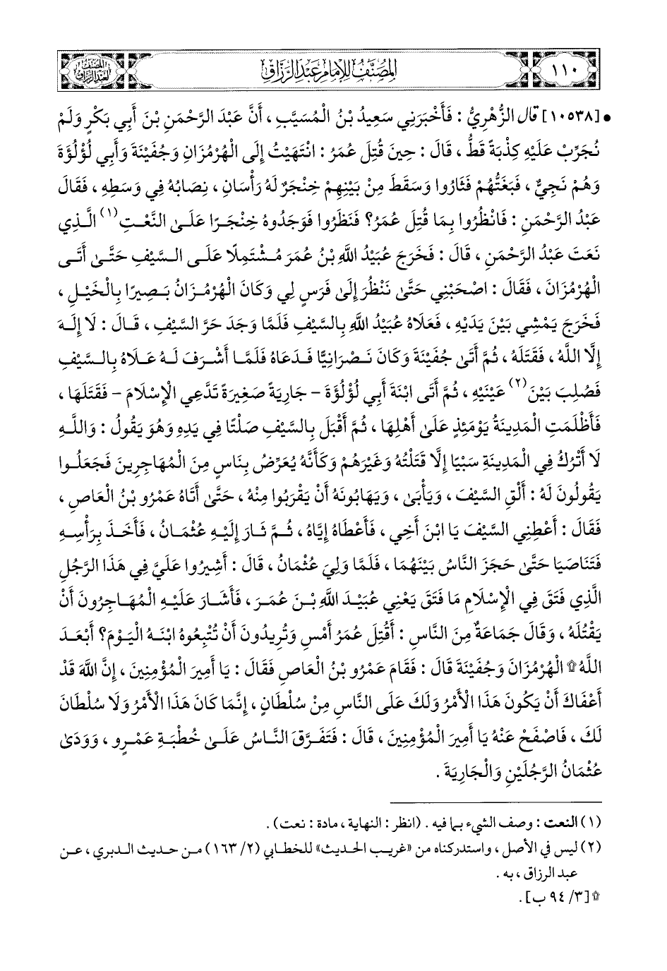 10538- قَالَ الزُّهْرِيُّ: فَأَخْبَرَنِي سَعيدُ بن المُسَيَّبِ، أَنَّ عَبدَ الرَّحْمَنِ بن أَبِي بَكْرٍ، وَلَمْ نُجَرِّبْ عَلَيْهِ كِذْبَةً قَطُّ، قَالَ حِينَ قُتِلَ عُمَرُ: انْتَهَيْتُ إِلَى الْهُرْمُزَانِ، وَجُفَيْنَةَ، وَأَبِي لُؤْلُؤَةَ، وَهُمْ نَجِيٌّ، فَبَغَتُّهُمْ، فَثَارُوا وَسَقَطَ مِنْ بَيْنَهُمْ خِنْجَرٌ لَهُ رَأْسَانِ، نِصَابُهُ فِي وَسَطِهِ، فَقَالَ عَبدُ الرَّحْمَنِ: فَانْظُرُوا بِمَا قُتِلَ عُمَرُ؟ فَنَظَرُوا، فَوَجَدُوهُ خِنْجَرًا عَلَى النَّعْتِ الَّذِي نَعَتَ عَبدُ الرَّحْمَنِ، قَالَ: فَخَرَجَ عُبَيْدُ اللهِ بن عُمَرَ مُشْتَمِلاً عَلَى السَّيْفِ، حَتَّى أَتَى الْهُرْمُزَانَ، فَقَالَ: اصْحَبْنِي حَتَّى نَنْظُرَ إِلَى فَرَسٍ لِي، وَكَانَ الْهُرْمُزَانُ بَصِيرًا بِالْخَيْلِ، فَخَرَجَ يَمْشِي بَيْنَ يَدَيْهِ، فَعَلاَهُ عُبَيْدُ اللهِ بِالسَّيْفِ، فَلَمَّا وَجَدَ حَرَّ السَّيْفِ، قَالَ: لاَ إِلَهَ إِلاَّ اللهُ، فَقَتَلَهُ، ثُمَّ أَتَى جُفَيْنَةَ، وَكَانَ نَصْرَانِيًّا، فَدَعَاهُ، فَلَمَّا أَشْرَفَ لَهُ عَلاَهُ بِالسَّيْفِ، فَصُلِبَ بَيْنَ عَيْنَيْهِ،