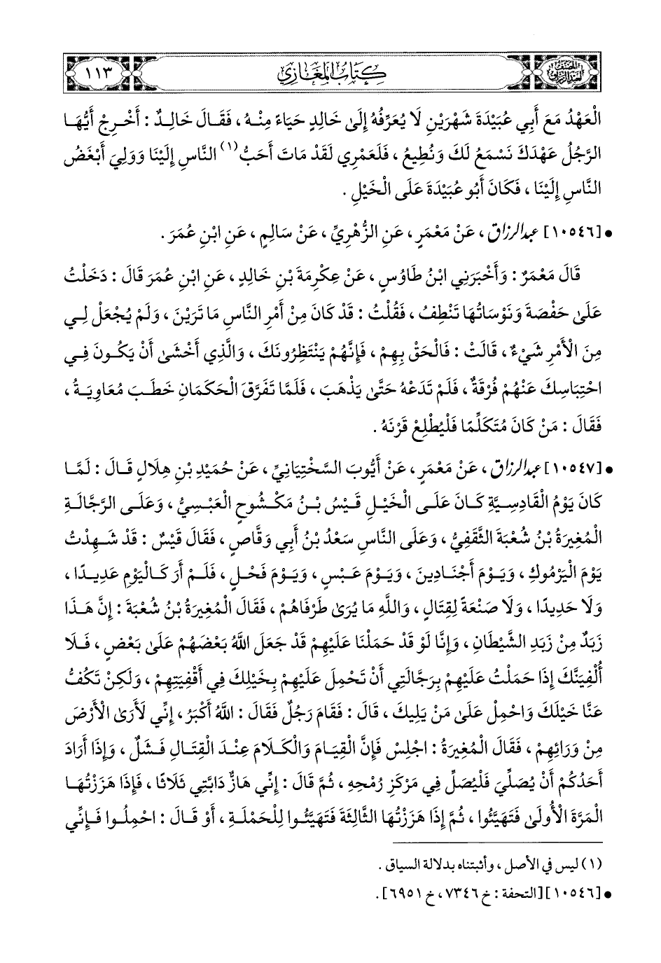 10547 - عبد الرزاق، عَنْ مَعْمَرٍ، عَنْ أَيُّوبَ السَّخْتِيَانِيِّ، عَن حُمَيْدِ بْنِ هِلاَلٍ، قَالَ: لَمَّا كَانَ يَوْمُ الْقَادِسِيَّةِ، كَانَ عَلَى الْخَيْلِ: قَيْسُ بن مَكْشُوحٍ الْعَبْسِيُّ، وَعَلَى الرَّجَّالَةِ: المُغِيرَةُ بن شُعْبَةَ الثَّقَفِيُّ، وَعَلَى النَّاسِ: سَعْدُ بن أَبِي وَقَّاصٍ، فَقَالَ قَيْسٌ: قَدْ شَهِدْتُ يَوْمَ الْيَرْمُوكِ، وَيَوْمَ أَجْنَادِينَ، وَيَوْمَ عَبْسٍ، وَيَوْمَ فَحْلٍ، فَلَمْ أَرَ كَالْيَوْمِ عَدِيدًا، وَلاَ حَدِيدًا، وَلاَ صَنْعَةً لِقِتَالٍ، وَاللهِ مَا يُرَى طَرَفَاهُمْ، فَقَالَ المُغِيرَةُ بن شُعْبَةَ: إِنَّ هَذَا زَبَدٌ مِنْ زَبَدِ الشَّيْطَانِ، وَإِنَّا لَوْ قَدْ حَمَلْنَا (1) عَلَيْهِمْ، قَدْ جَعَلَ اللهُ بَعْضَهُمْ عَلَى بَعْضٍ، فَلاَ أُلْفِيَنَّكَ إِذَا حَمَلَتُ عَلَيْهِمْ بِرَجَّالَتِي أَنْ تَحْمِلَ عَلَيْهِمْ بِخَيْلِكَ فِي أَقْفِيَتِهِمْ، وَلَكِنْ تَكُفُّ عَنَّا خَيْلَكَ، وَاحْمِلْ عَلَى مَنْ يَلِيكَ، قَالَ: فَقَامَ رَجُلٌ، فَقَالَ: اللهُ أَكْبَرُ، إِنِّي لأَرَى الأَرْضَ مِنْ وَرَائِهِمْ، فَقَالَ المُغِيرَةُ: اجْلِسْ، فَإِنَّ الْقِيَامَ وَالْكَلاَمَ عِنْدَ الْقِتَالِ فَشَلٌ، وَإِذَا أَرَادَ أَحَدُكُمْ أَنْ يصلي فليصل (2) فِي مَرْكَزِ رُمْحِهِ، ثُمَّ قَالَ: إِنِّي هَازٌّ دَابَّتِي ثَلاَثًا، فَإِذَا هَزَزْتُهَا المَرَّةَ الأُولَى، فَتَهَيَّؤُوا، ثُمَّ إِذَا هَزَزْتُهَا الثَّالِثَةَ، فَتَهَيَّؤُوا لِلْحَمْلَةِ، أَوْ قَالَ: احْمِلُوا، فَإِنِّي حَامِلٌ، قَالَ: فَهَزَّهَا الثَّالِثَةَ، ثُمَّ حَمَلَ، وَإِنَّ عَلَيْهِ لَدِرْعَيْنِ، قَالَ: فَمَا وَصَّلْنَا لِنَفْسِهِ حَتَّى صَافَيَهُمْ (3) بِطَعْنَتَيْنِ وَفَلَتْ عَيْنُهُ (4)، وَكَانَ الْفَتْحُ، قَالَ: فَجَعَلَ اللهُ بَعْضَهُمْ عَلَى بَعْضٍ، حَتَّى يَكُونُوا رُكَامًا، فَمَا نَشَاءُ أَنْ نَأْخُذَ برجلَيْنِ (5) وَاحِدٍ مِنْهُمْ، فَنَقْتُلُهُ إِلاَّ فَعَلْتُ.