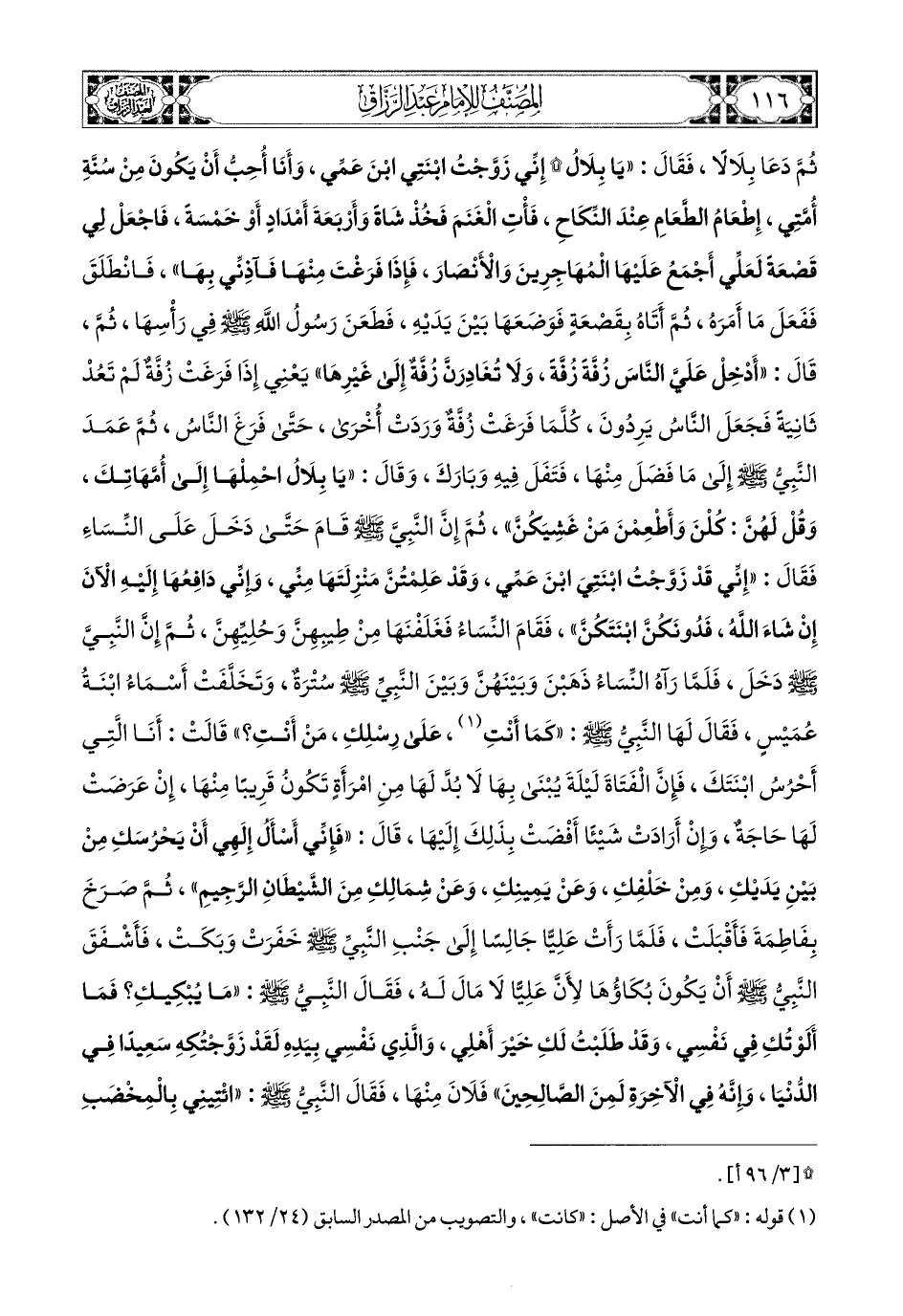 ثُمَّ إِنَّ النَّبِيَّ صَلَّى اللهُ عَلَيْهِ وَسَلَّمَ قَامَ، حَتَّى دَخَلَ عَلَى النِّسَاءِ، فَقَالَ: إِنِّي قَدْ زَوَّجْتُ ابْنَتِي ابْنَ عَمِّي، وَقَدْ عَلِمْتُنَّ مَنْزِلَتَهَا مِنِّي، وَإِنِّي دَافِعُهَا إِلَيْهِ الآنَ، إِنْ شَاءَ اللهُ، فَدُونَكُنَّ ابْنَتَكُنَّ، فَقَامَ النِّسَاءُ، فَغَلَفْنَهَا مِنْ طِيبِهِنَّ وَحُلِيِّهِنَّ، ثُمَّ إِنَّ النَّبِيَّ صَلَّى اللهُ عَلَيْهِ وَسَلَّمَ دَخَلَ، فَلَمَّا رَآهُ النِّسَاءُ ذَهَبْنَ، وَبَيْنَهُنَّ وَبَيْنَ النَّبِيِّ صَلَّى اللهُ عَلَيْهِ وَسَلَّمَ سُتْرَةٌ، وَتَخَلَّفَتْ أَسْمَاءُ ابْنَةُ عُمَيْسٍ، فَقَالَ لَهَا النَّبِيُّ صَلَّى اللهُ عَلَيْهِ وَسَلَّمَ: كَمَا أَنْتِ، عَلَى رِسْلِكِ، مَنْ أَنْتِ؟ قَالَتْ: أَنَا الَّتِي أَحْرُسُ ابْنَتَكَ، فإِنَّ الْفَتَاةَ لَيْلَةَ يُبْنَى بِهَا، لاَ بُدَّ لَهَا مِنِ امْرَأَةٍ تَكُونُ قَرِيبًا مِنْهَا، إِنْ عَرَضَتْ لَهَا حَاجَةٌ، وإن أَرَادَتْ شَيْئًا أَفْضَتْ بِذَلِكَ إِلَيْهَا، قَالَ: فَإِنِّي أَسْأَلُ إِلَهِي أَنْ يَحْرُسَكِ مِنْ بَيْنَ يَدَيْكِ، وَمِنْ خَلْفِكِ، وَعَنْ يَمِينِكِ، وَعَنْ شِمَالِكِ، مِنَ الشَّيْطَانِ الرَّجِيمِ، ثُمَّ صَرَخَ بِفَاطِمَةَ، فَأَقْبَلَتْ، فَلَمَّا رَأَتْ عَلِيًّا جَالِسًا إِلَى جَنْبِ النَّبِيِّ صَلَّى اللهُ عَلَيْهِ وَسَلَّمَ، خفرَتْ وَبَكَتْ، فَأَشْفَقَ النَّبِيُّ صَلَّى اللهُ عَلَيْهِ وَسَلَّمَ أَنْ يَكُونَ بُكَاؤُهَا لأَنَّ عَلِيًّا لاَ مَالَ لَهُ، فَقَالَ النَّبِيُّ صَلَّى اللهُ عَلَيْهِ وَسَلَّمَ: مَا يُبْكِيكِ؟ فَمَا أَلَوْتُكِ فِي نَفْسِي، وَقَدْ طلبْتُ لَكِ خَيْرَ أَهْلِي، وَالَّذِي نَفْسِي بِيَدِهِ، لَقَدْ زَوَّجْتُكِهِ سَعيدًا فِي الدُّنْيَا، وَإِنَّهُ فِي الآخِرَةِ لَمِنَ الصَّالِحِينَ، فَلاَنَ مِنْهَا، فَقَالَ النَّبِيُّ صَلَّى اللهُ عَلَيْهِ وَسَلَّمَ: ائْتِينِي بِالمِخْضَبِ، فَامْلَئِيهِ مَاءً، فَأَتَتْ أَسْمَاءُ بِالمِخْضَبِ، فَمَلأَتْهُ مَاءً، ثُمَّ مَجَّ النَّبِيُّ صَلَّى اللهُ عَلَيْهِ وَسَلَّمَ فِيهِ، وَغَسَلَ فِيهِ قَدَمَيْهِ وَوَجْهَهُ،