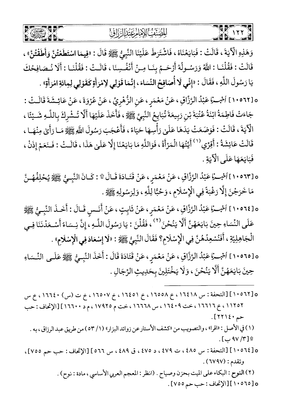 10565 - أخبرنا عبد الرزاق، عَنْ مَعْمَرٍ، عَن قَتَادَةَ، قَالَ: أَخَذَ النَّبِيُّ صَلَّى اللهُ عَلَيْهِ وَسَلَّمَ عَلَى النِّسَاءِ حِينَ بَايَعَهُنَّ أَنْ لاَ يَنُحْنَ، وَلاَ يَخْتَلِينَ (1) بِحَدِيثِ الرِّجَالِ.