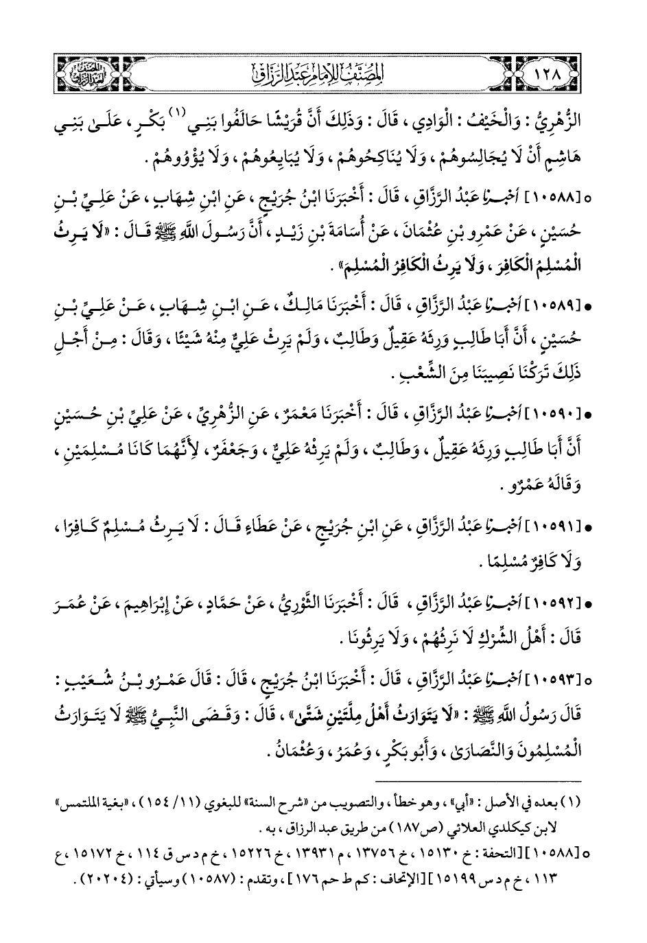 10590- أخبرنا عبد الرزاق، قال: أَخْبَرَنَا مَعْمَرٌ، عَنِ الزُّهْرِيِّ، عَنْ عَلِيِّ بْنِ حُسَيْنٍ؛ أَنَّ أَبَا طَالِبٍ وَرِثَهُ عَقِيلٌ، وَطَالِبٌ، وَلَمْ يَرِثْهُ عَلِيٌّ، وَجَعْفَرٌ؛ لأَنَّهُمَا كَانَا مُسْلِمَيْنِ.
