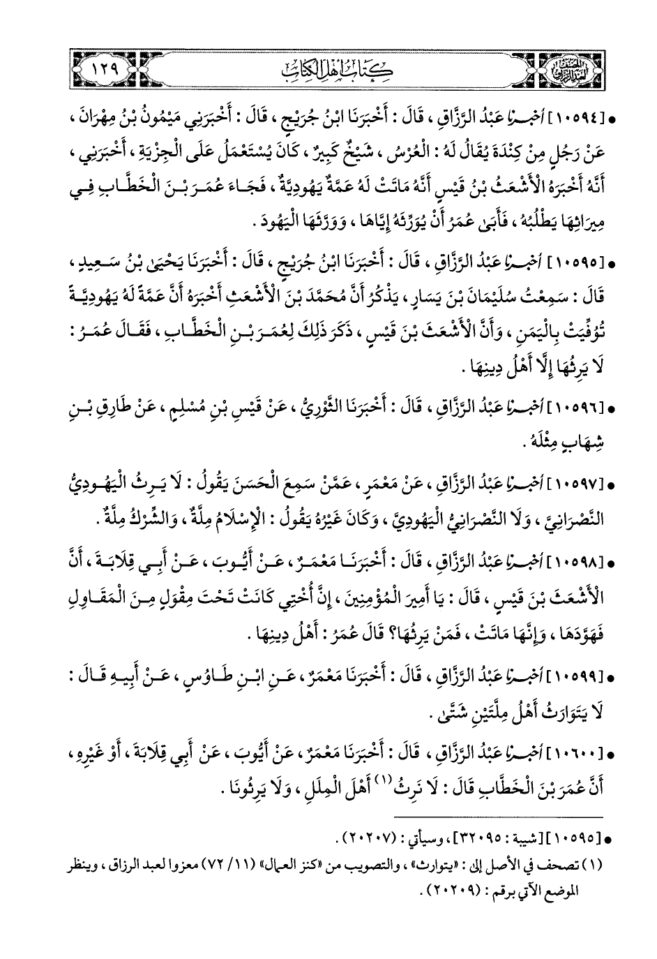 10594- أخبرنا عبد الرزاق، قال: أَخْبَرَنَا ابْنُ جُرَيْجٍ، قَالَ: أَخْبَرَنِي مَيْمُونُ بن مِهْرَانَ، عَن رَجُلٍ مِنْ كِنْدَةَ، يُقَالَ لَهُ: الْعُرْسُ، شَيْخٌ كَبِيرُ، كَانَ يُسْتَعْمَلُ عَلَى الْجَزية (1)، أَخْبَرَنِي أَنَّهُ أَخْبَرَهُ الأَشْعَثُ بن قَيْسٍ؛ أَنَّهُ مَاتَتْ لَهُ عَمَّةٌ يَهُودِيَّةٌ، فَجَاءَ عُمَرَ بن الْخَطَّابِ فِي مِيرَاثِهَا يَطْلُبُهُ، فَأَبَى عُمَرُ أَنْ يُورِّثَهُ إِيَّاهَا، وَوَرَّثَهَا الْيَهُودُ.