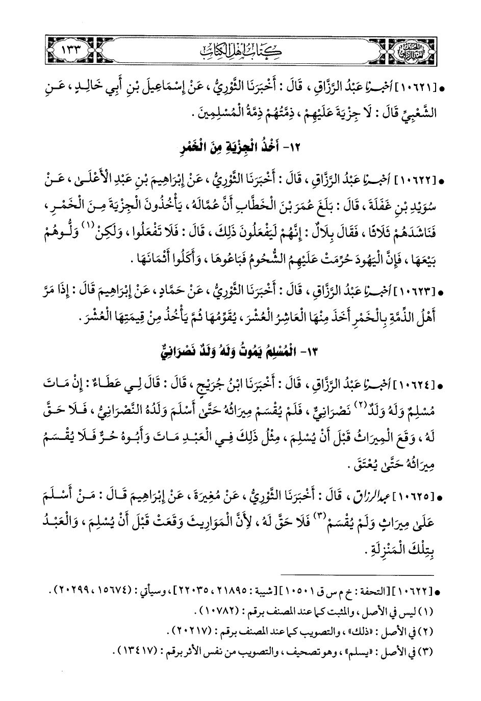10621- أخبرنا عبد الرزاق، قال: أَخْبَرَنَا الثَّورِيُّ، عَن إِسْمَاعِيلَ بْنِ أَبِي خَالِدٍ، عَنِ الشَّعْبِيِّ، قَالَ: لاَ جِزْيَةَ عَلَيْهِمْ، ذِمَّتُهُمُ ذِمَّةُ المُسْلِمِينَ.
