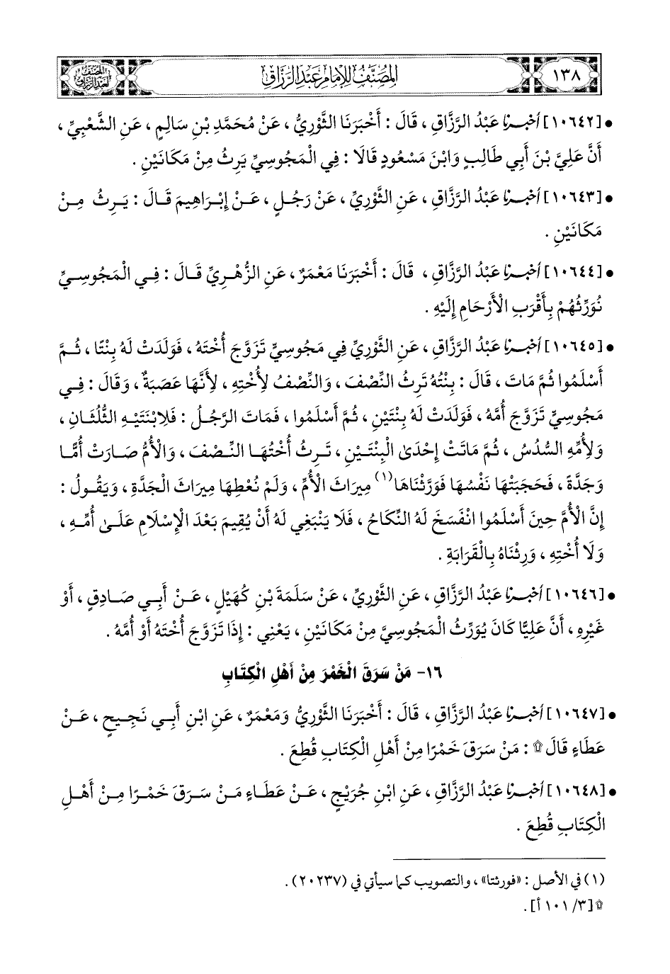 10644- أخبرنا عبد الرزاق، قال: أَخْبَرَنَا مَعْمَرٌ، عَنِ الزُّهْرِيِّ، قَالَ فِي المَجُوسِيِّ: نُورِّثُهُمْ بِأَقْرَبِ الأَرْحَامِ إِلَيْهِ.