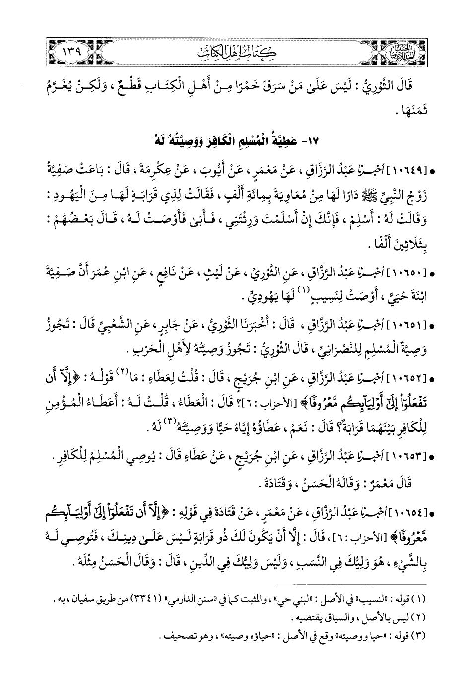10650- أخبرنا عبد الرزاق، عَنِ الثَّورِيِّ، عَن لَيْثٍ، عَن نَافِعٍ، عَنِ ابْنِ عُمَرَ؛ أَنَّ صَفِيَّةَ ابْنَةَ حُيَيٍّ أَوْصَتْ لِنَسِيبٍ لَهَا يَهُودِيٍّ.