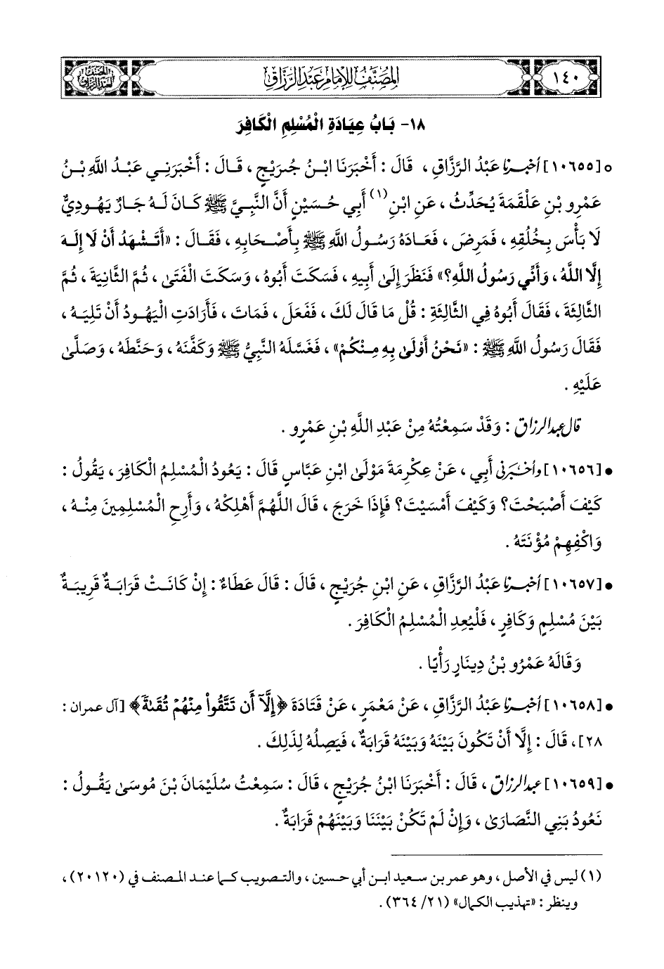 10657 - أخبرنا عبد الرزاق، عَنِ ابْنِ جُرَيْجٍ، قَالَ: قَالَ عَطَاءٌ: إِنْ كَانَتْ قَرَابَةٌ قَرِيبَةٌ بَيْنَ مُسْلِمٍ وَكَافِرٍ، فَلْيَعُدِ المُسْلِمُ الْكَافِرَ.