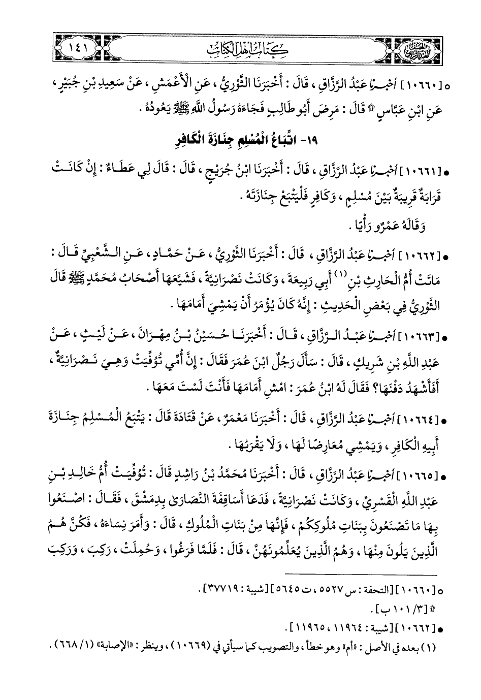 10662- أخبرنا عبد الرزاق، قال: أَخْبَرَنَا الثَّورِيُّ، عَن حَمَّادٍ، عَنِ الشَّعْبِيِّ، قَالَ: مَاتَتَ أُمُّ الْحَارِثِ بْنِ أَبِي رَبِيعَةَ، وَكَانَتْ نَصْرَانِيَّةً، فَشَيَّعَهَا أَصْحَابُ مُحَمَّدٍ صَلَّى اللهُ عَلَيْهِ وَسَلَّمَ.