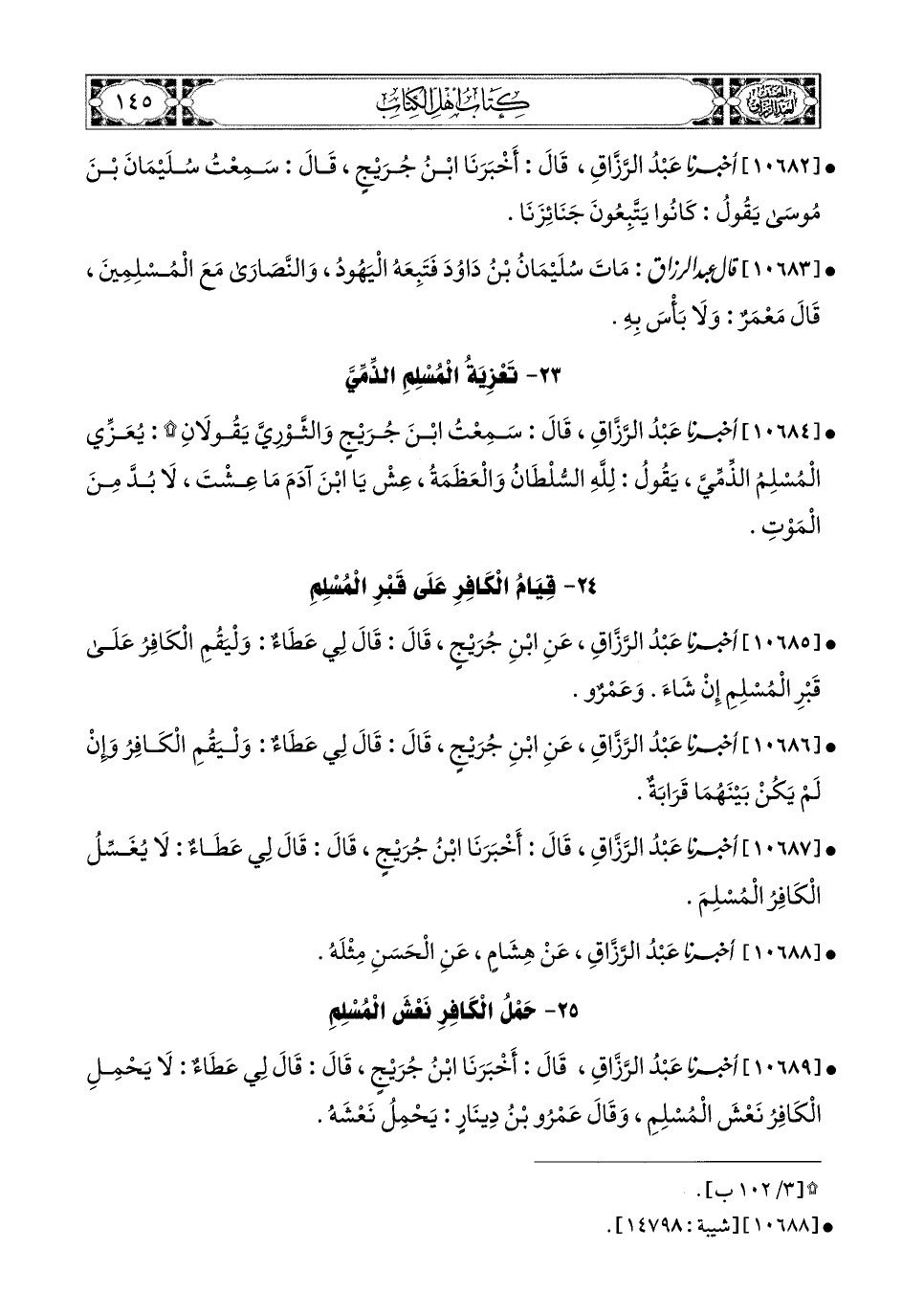 10684- أخبرنا عبد الرزاق، قَالَ: سَمِعْتُ ابْنَ جُرَيْجٍ، وَالثَّورِيَّ، يَقُولاَنِ: يُعَزِّي المُسْلِمُ الذِّمِّيَّ، يَقُولُ: للهِ السُّلْطَانُ وَالْعَظَمَةُ، عِشْ يَا ابْنَ آدَمَ مَا عِشْتَ، لاَ بُدَّ مِنَ المَوْتِ.